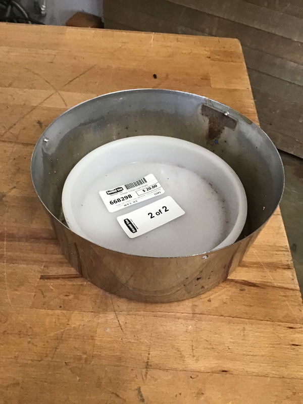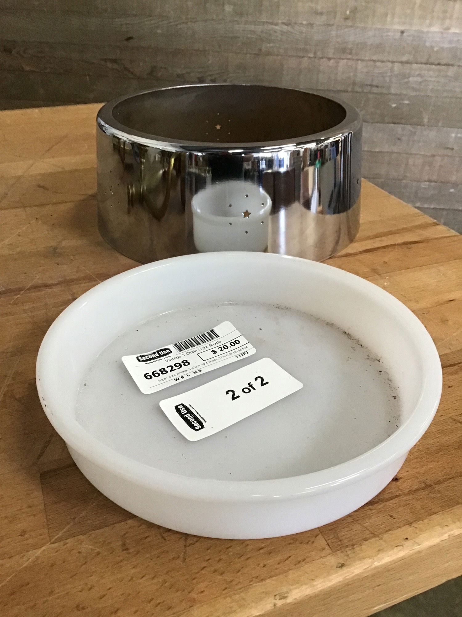 Super cute vintage 3-chain light shade. This cute shade features a polished steel body with starlight's around the side. In the center sits a shallow white glass dish. Looks to be mid-century. With the right parts and a little patience this would look very cute in a bedroom.