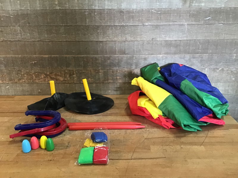 Fun outdoor family game set. Includes potato sack race bags, fake eggs for a spoon and race game, 3 legged race bands and more!