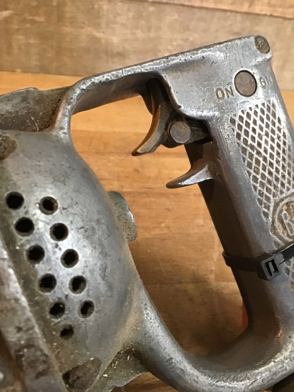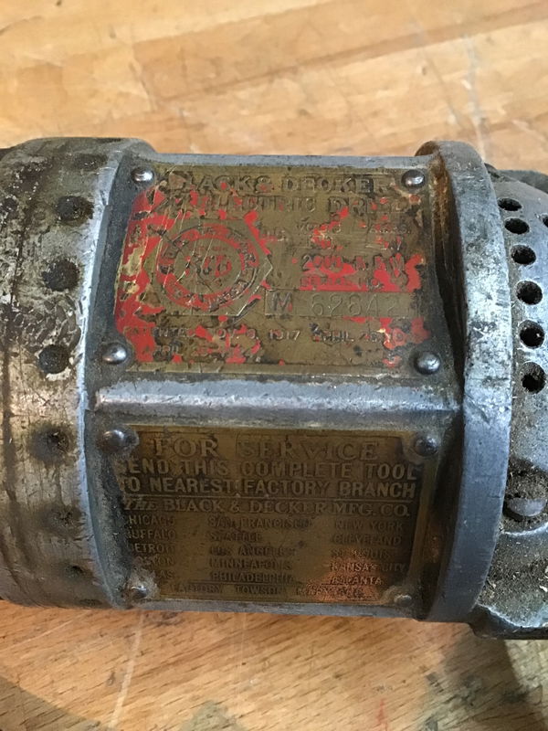 B&D 1917 pat. corded drill. This drill is the patent for the first ever modern trigger switch, pistol grip design corded drill! This was the birth of corded power tools, amazing! There's a high chance this thing was building planes to aid the allied powers' war effort. Might've even contributed to both world wars. Very cool piece of history, and the motor feels like it might still be functional.
