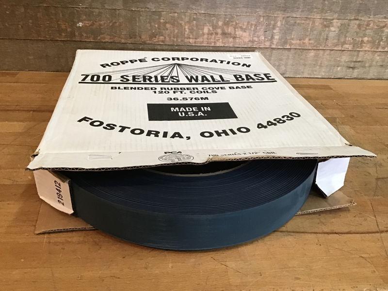 Never installed roll of 120' "Deep Navy" tone wall base. 2.5" tall. Great looking color. By Roppe Corporation.