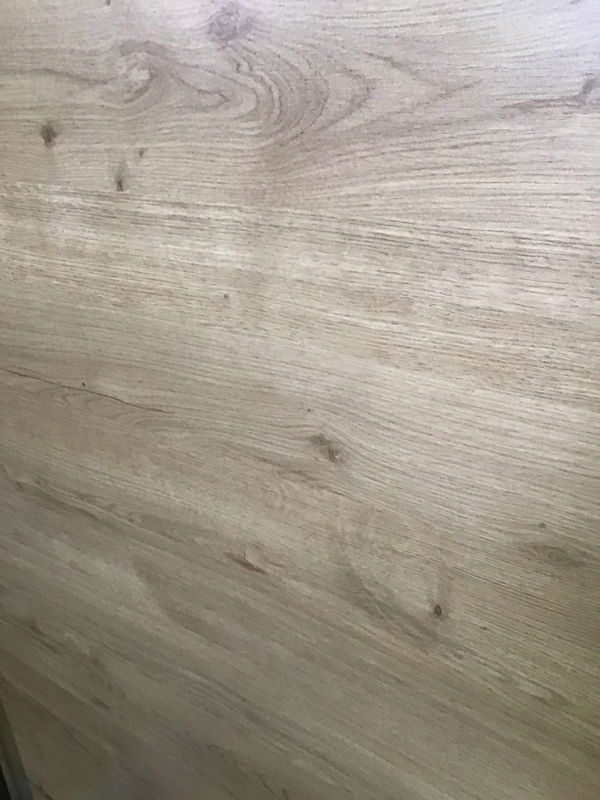 Thick 1 1/2" formica faced particle board. Has a faux wood print on one side and plain brown side with some scratches. Corners are chipped but has plenty of useful material to work with.
