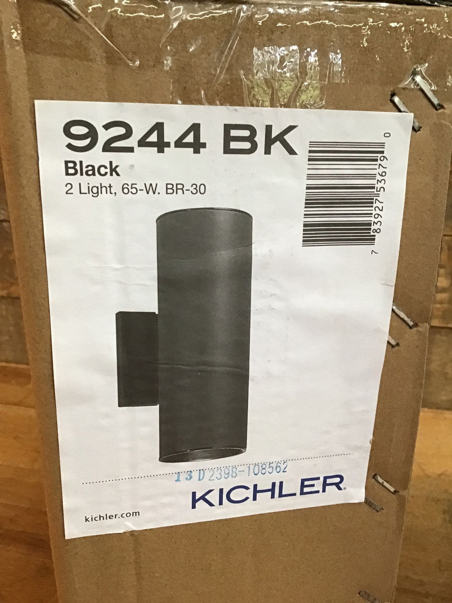 Super sleek sconce by Kichler, featuring a black cylindrical fixture that fits two standard bulbs. Suitable for damp locations. This came to us new in sealed box and has never been installed. Sells new online for over $100. Photo may be representational.