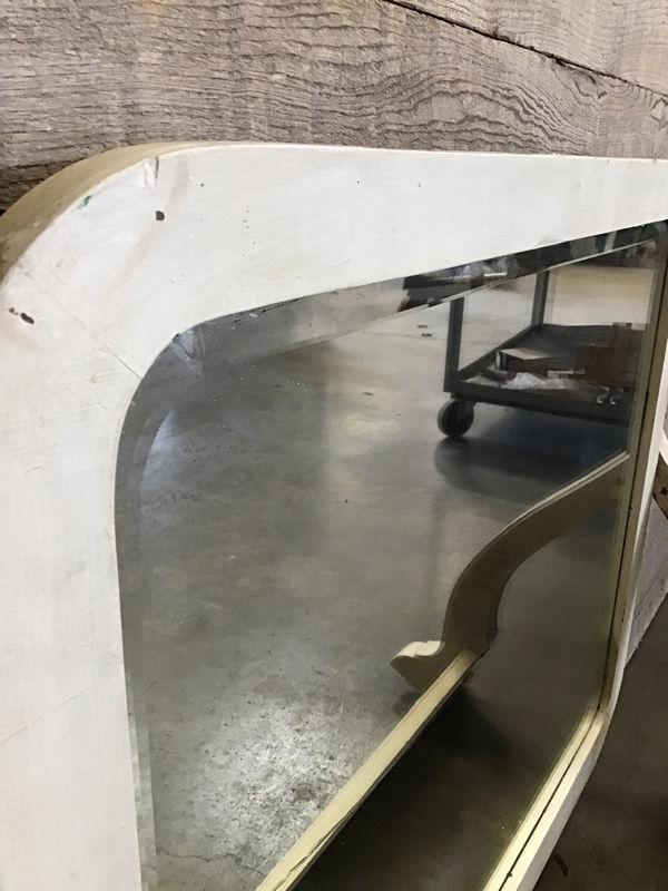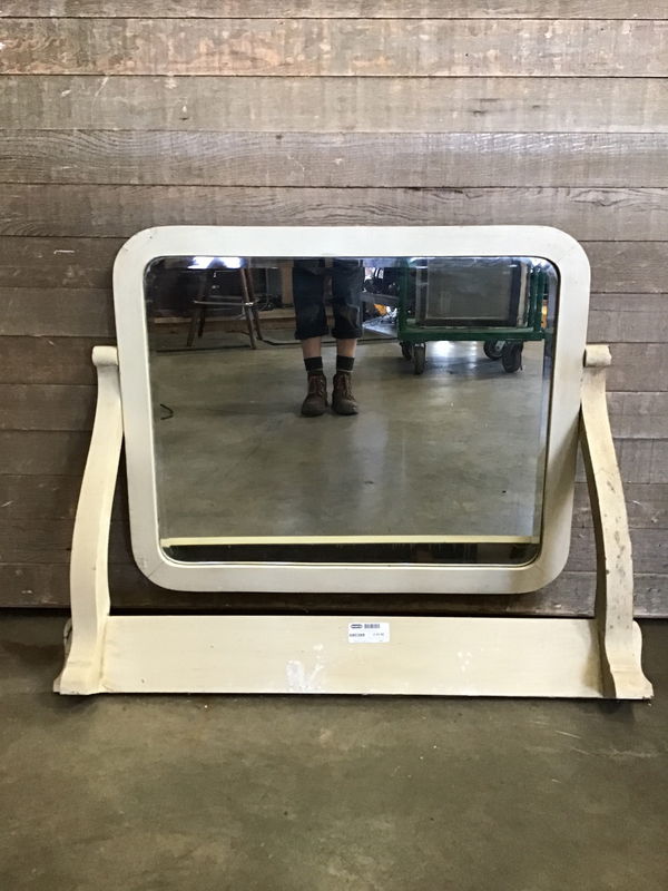An antique beveled mirror that is apparently haunted according to my coworker. High chance it belonged to a vanity but has been left to fend for itself. Glass has some desilvering but is still in pretty good condition for its age. Would be super easy to remove its awkward stand and hang it on a wall. Very cute piece.