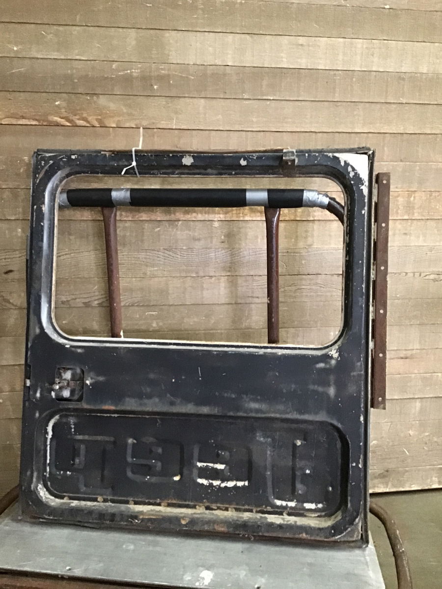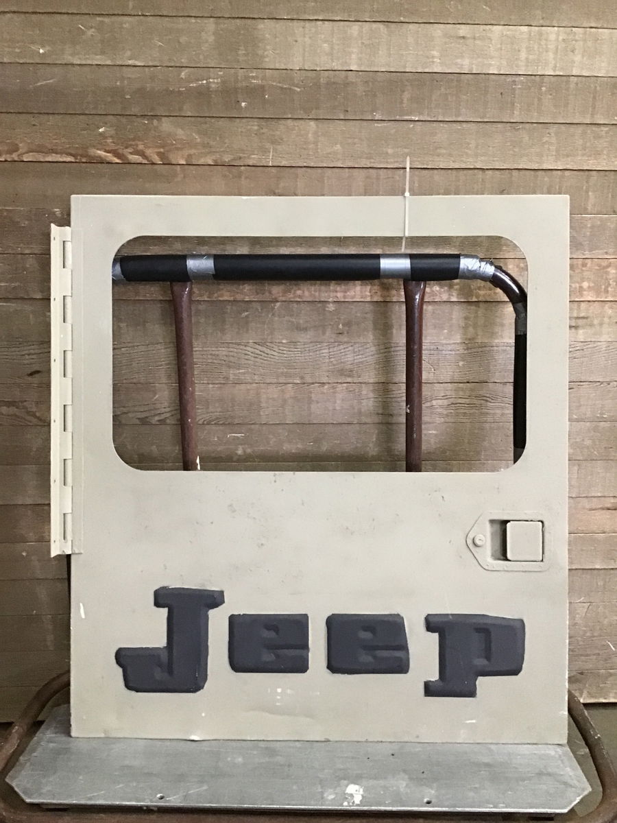 Steel car door, model looks to be 70's Kaiser DJ5 Postal Jeep. The large window is missing the glass. Painted tan with black painted letters. Nice decor piece to add to your shop wall. Still includes piano hinge and latch. Dinosaurs sold separately.