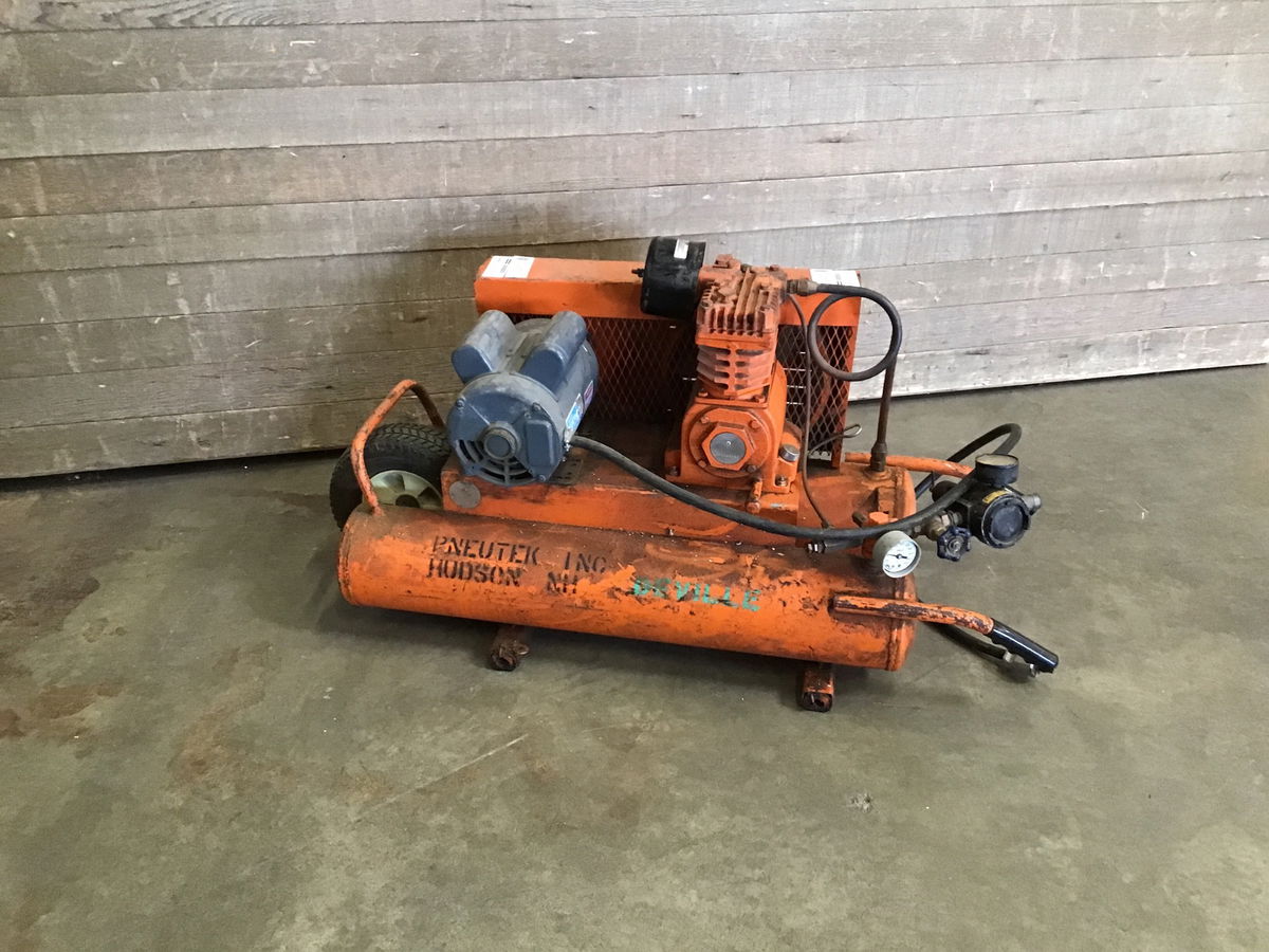 Heavily used, heavy duty wheelbarrow air compressor. Tested and pump appeared to pump just fine. Has a hiss near the regulator so will probably need some tightening. Make sure to check the pump oil level!