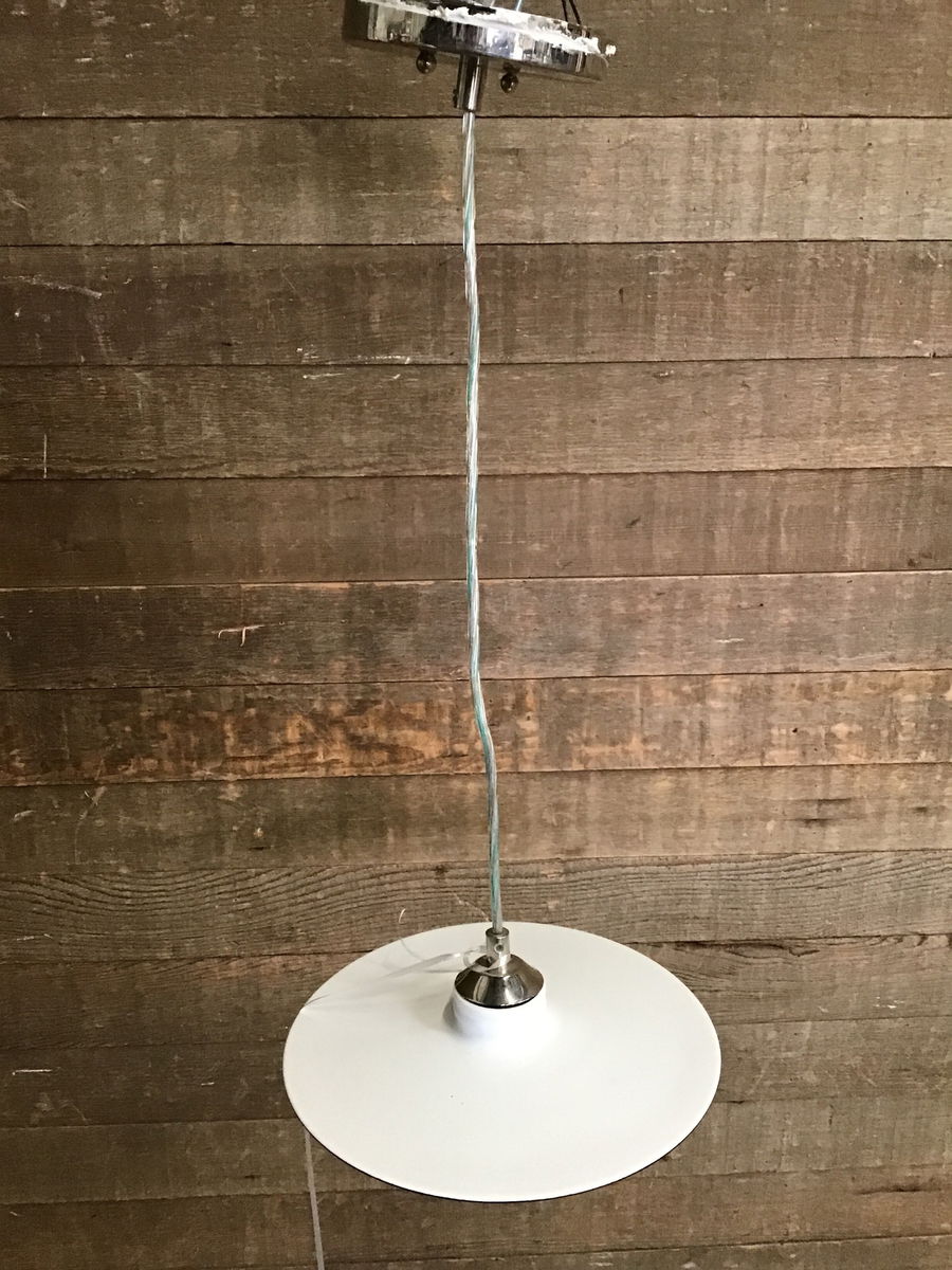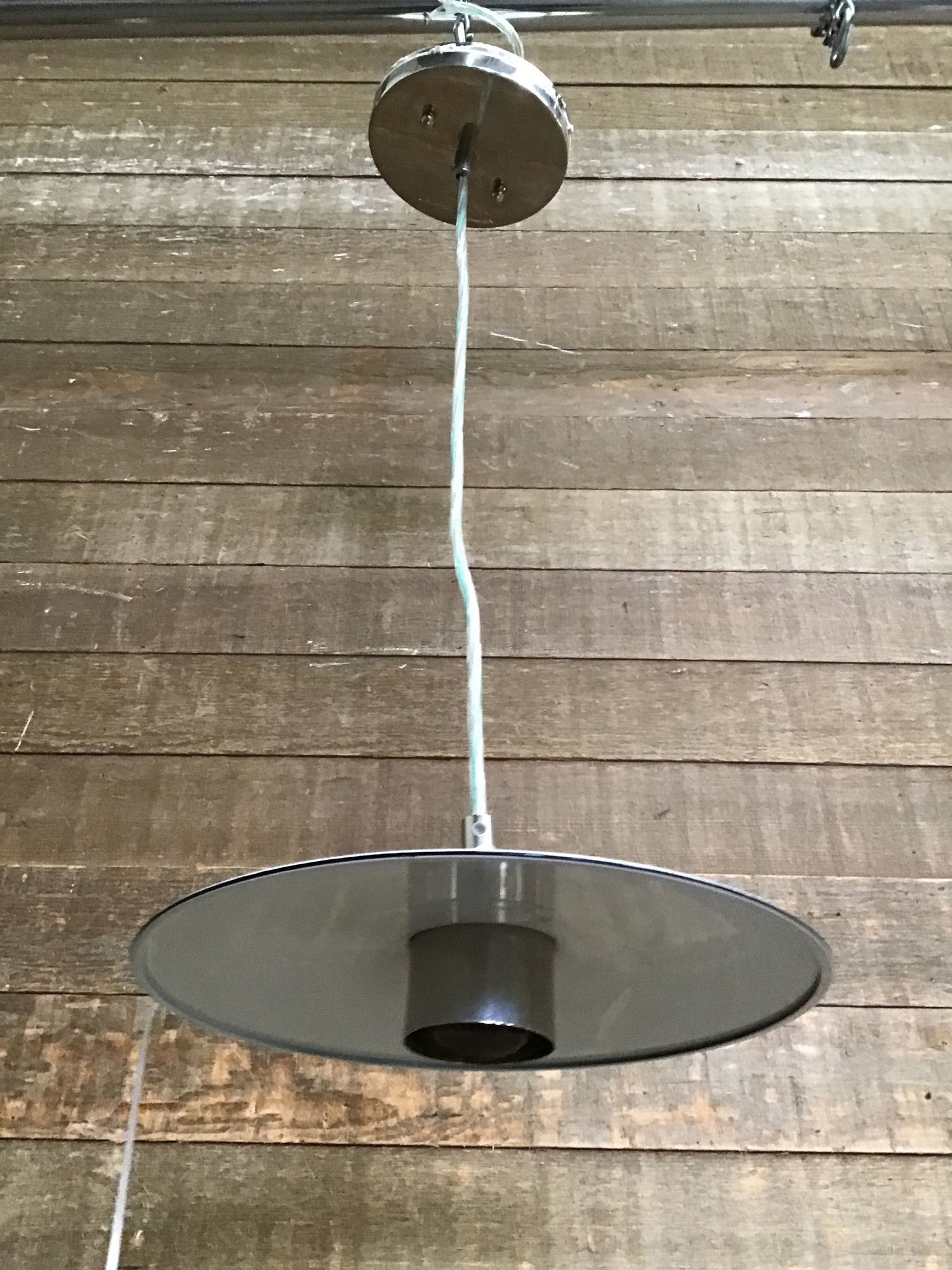 Cool hanging disc light fixture in good, used condition. No shade, so would look best with a decorative/Edison bulb. Measurement does not include about 18" of wire. Wire looks to be in good condition and is for dry locations only.