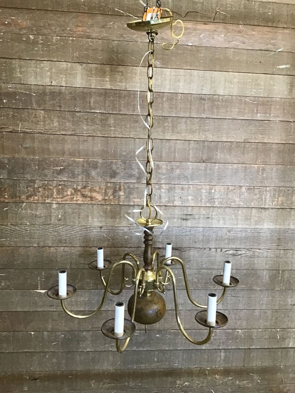6 Arm brass chandelier in good, used condition. Wiring looks to be in good condition, though we always recommend a full test prior installation. Height listed does not include about 20" of chain.