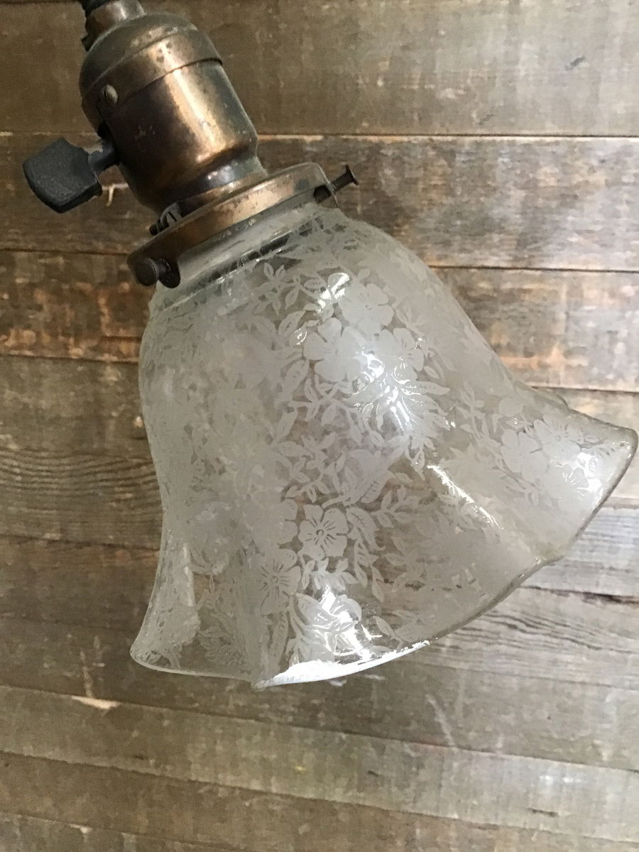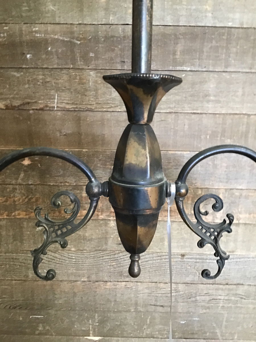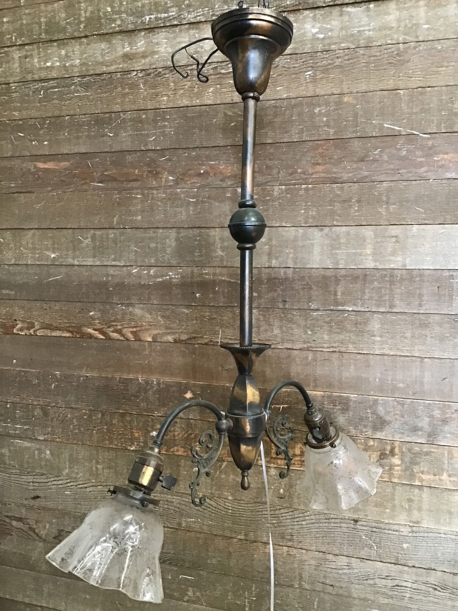 Vintage Pendant light fixture with a Japaned copper finish and Decorative glass shades. This beauty came from an old 1900s house and looks to have been rewired at some time. New wire looks to be in good condition, though we always recommend a full test prior to installation. The shades are likely not original, and we cannot tell if they're old or reproduction.