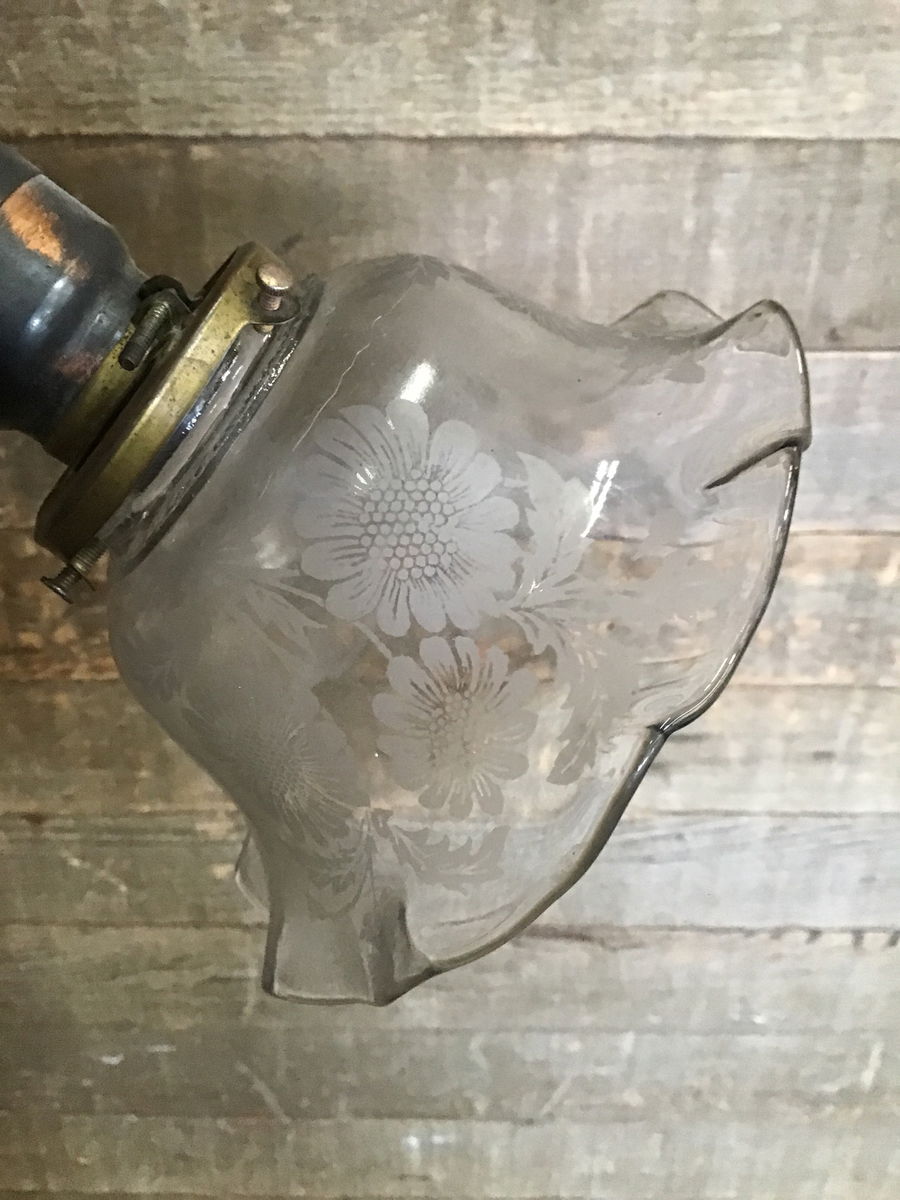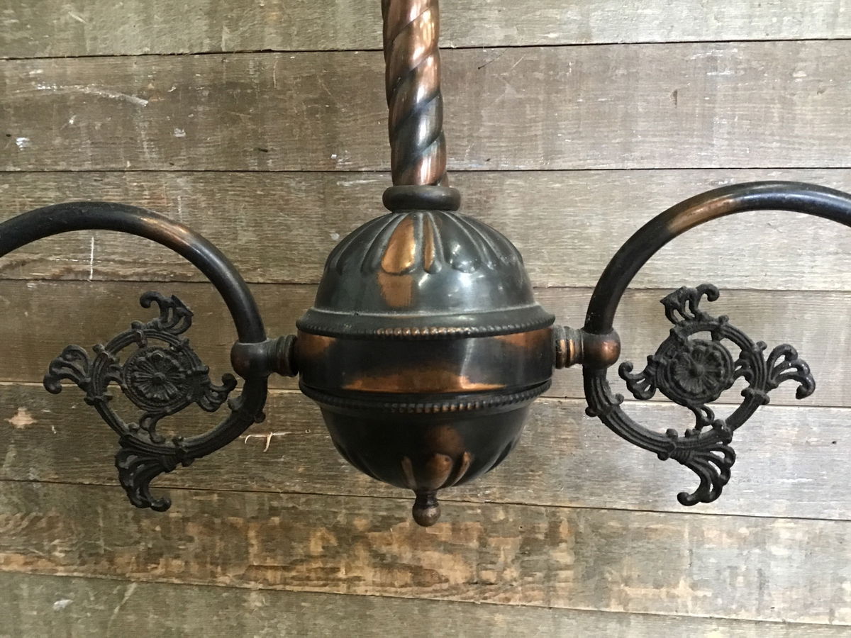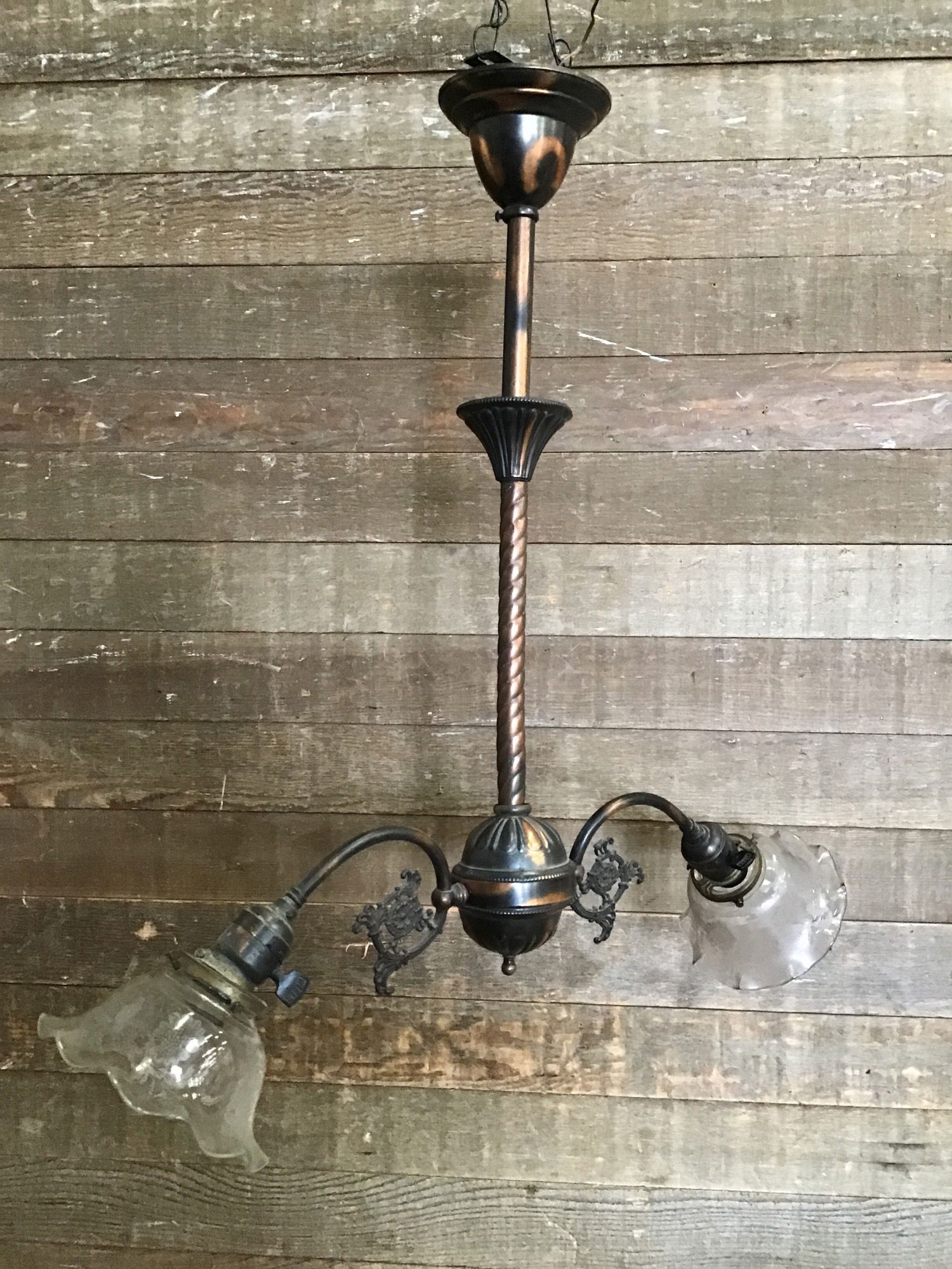 Vintage Pendant light fixture with a Japaned copper finish and Decorative glass shades. This beauty came from an old 1900s house and looks to have been rewired at some time. One socket appears to be non functioning, and would need to be replaced. New wire looks to be in good condition, though we always recommend a full test prior to installation. The shades are likely not original, and we cannot tell if they're old or reproduction.