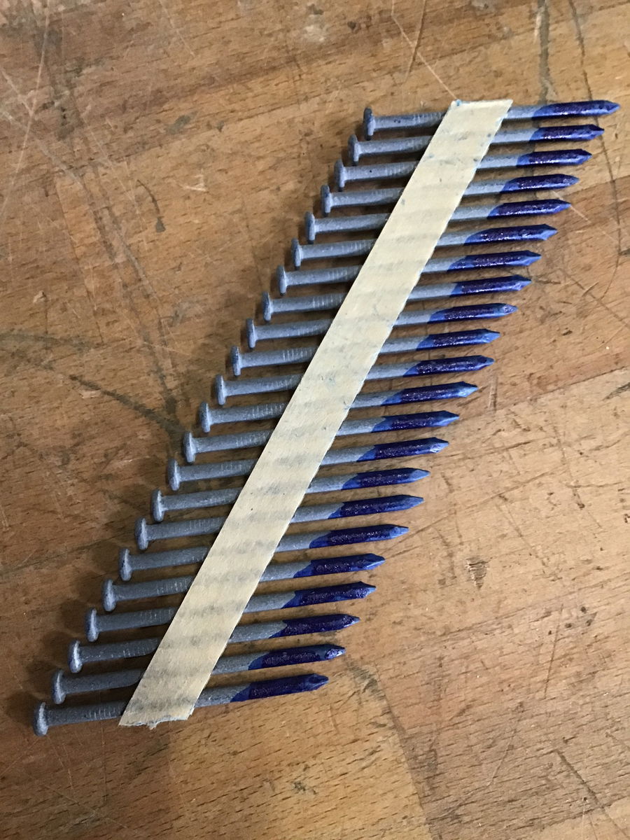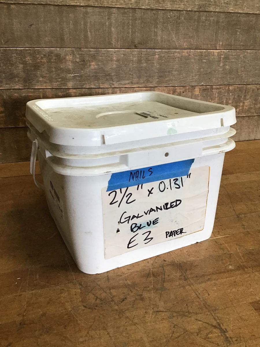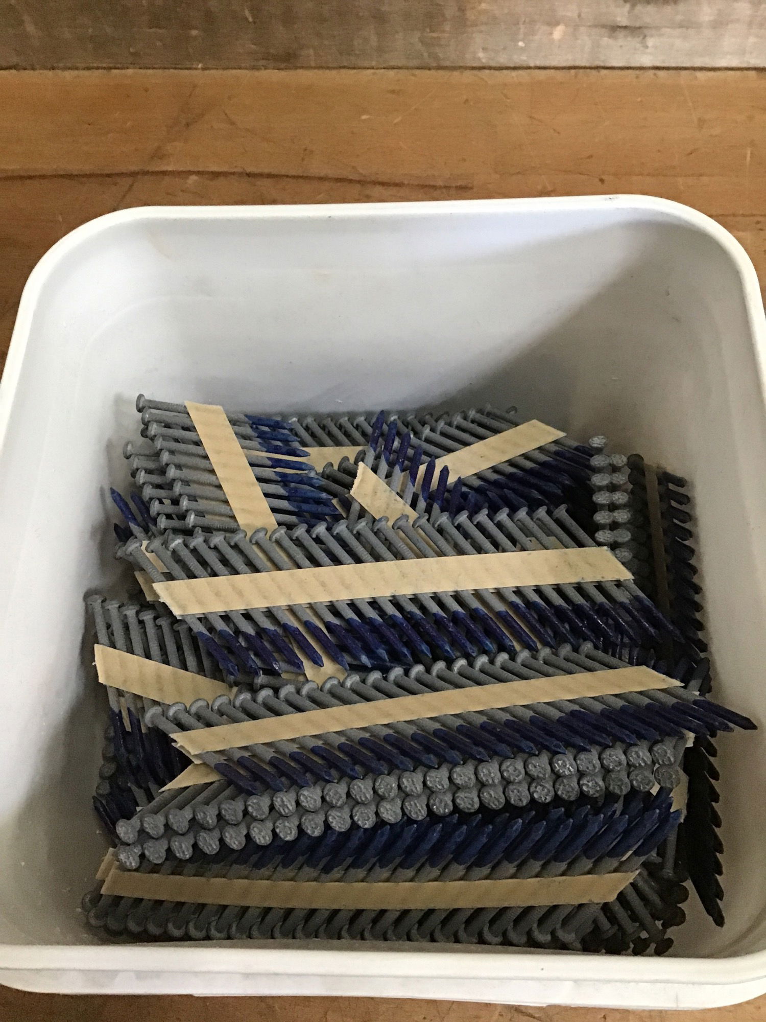 Just over half a bucket of nails. 2-1/2" x 0.131", galvanized blue E3 nails.
