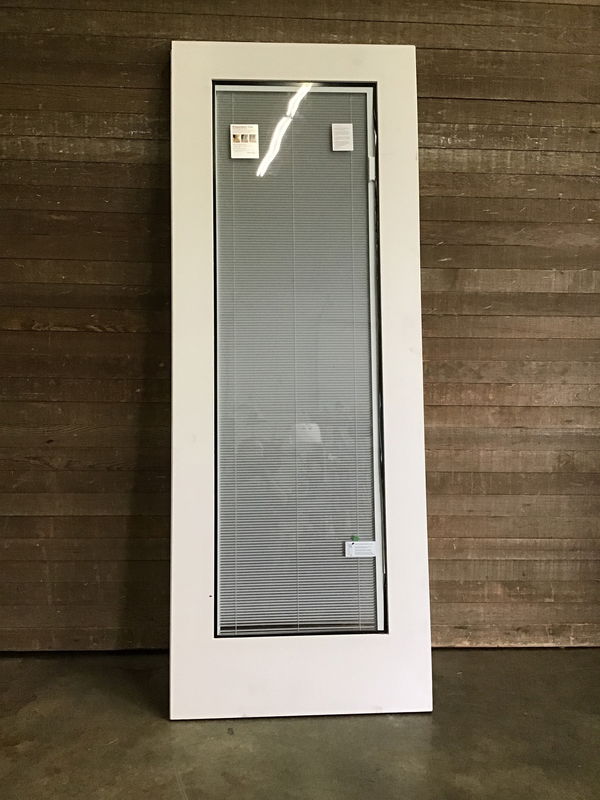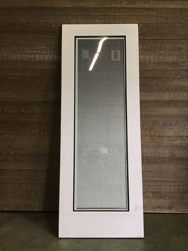 Overheight fiberglass clad french thermopane door by ThermaTrue. Has internal blinds. Never installed though has a superficial crack at the edge of a stile and a notch missing on the top of the stile.