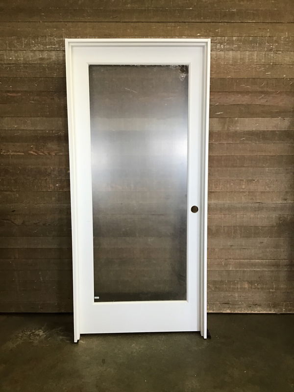 Primed full lite clear glass single pane french door with a left hand swing. Pre hung on a double rab jamb with brushed nickel hinges. Still has protective film on glass.