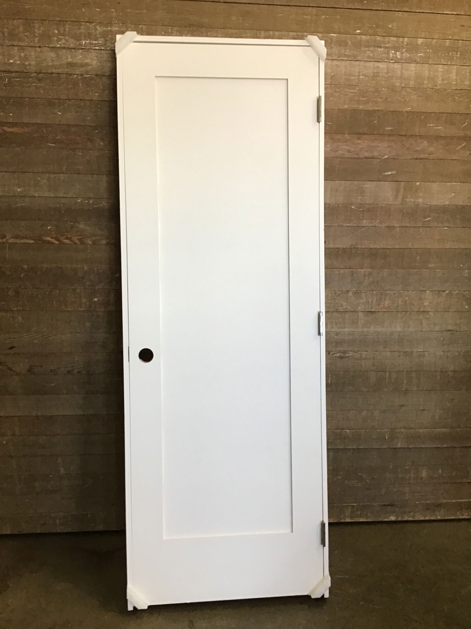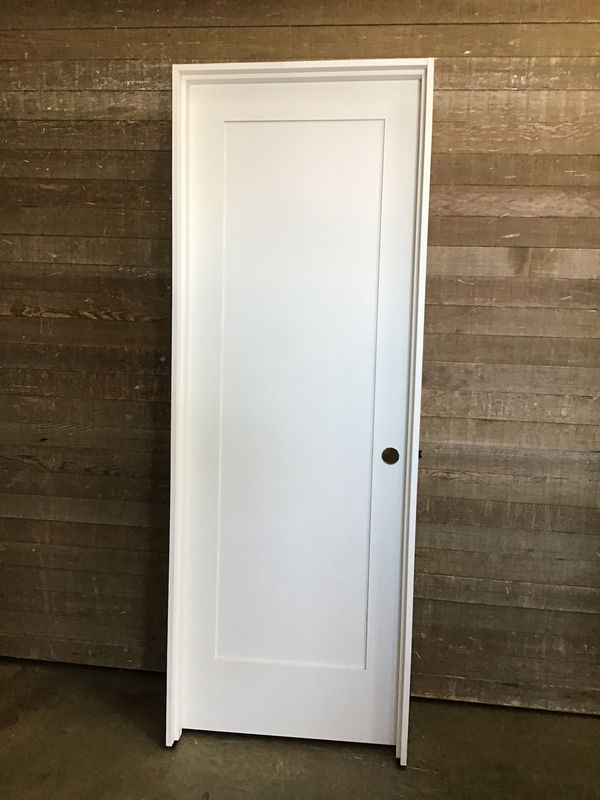 Never installed, 28" single shaker panel door in jamb. This is a solid wood door with a primed masonite veneer, ready to be painted the color of your choice. Item may have cosmetic damage.