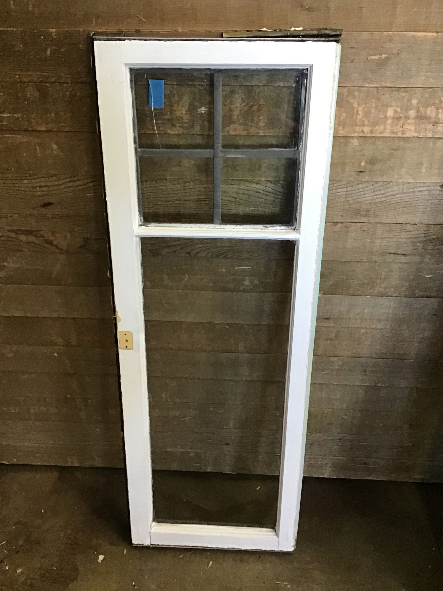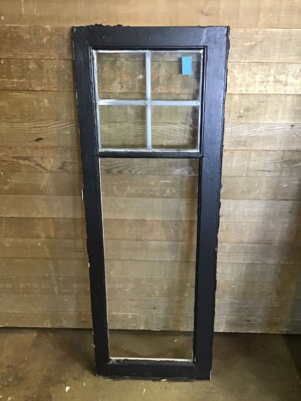 This a nice farmhouse window sash with leaded glass, wooden frame painted black on one side and white on the other, with a leaded partition between the true-divided panes and some vintage hardware. Note that this item contains lead, and also that this window has a crack in one of the panes and will likely need replaced, price reflects. Would be perfect for a cold frame, as porch art, or for a new crafting project!