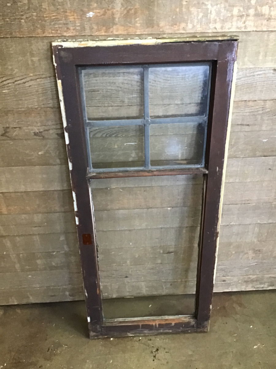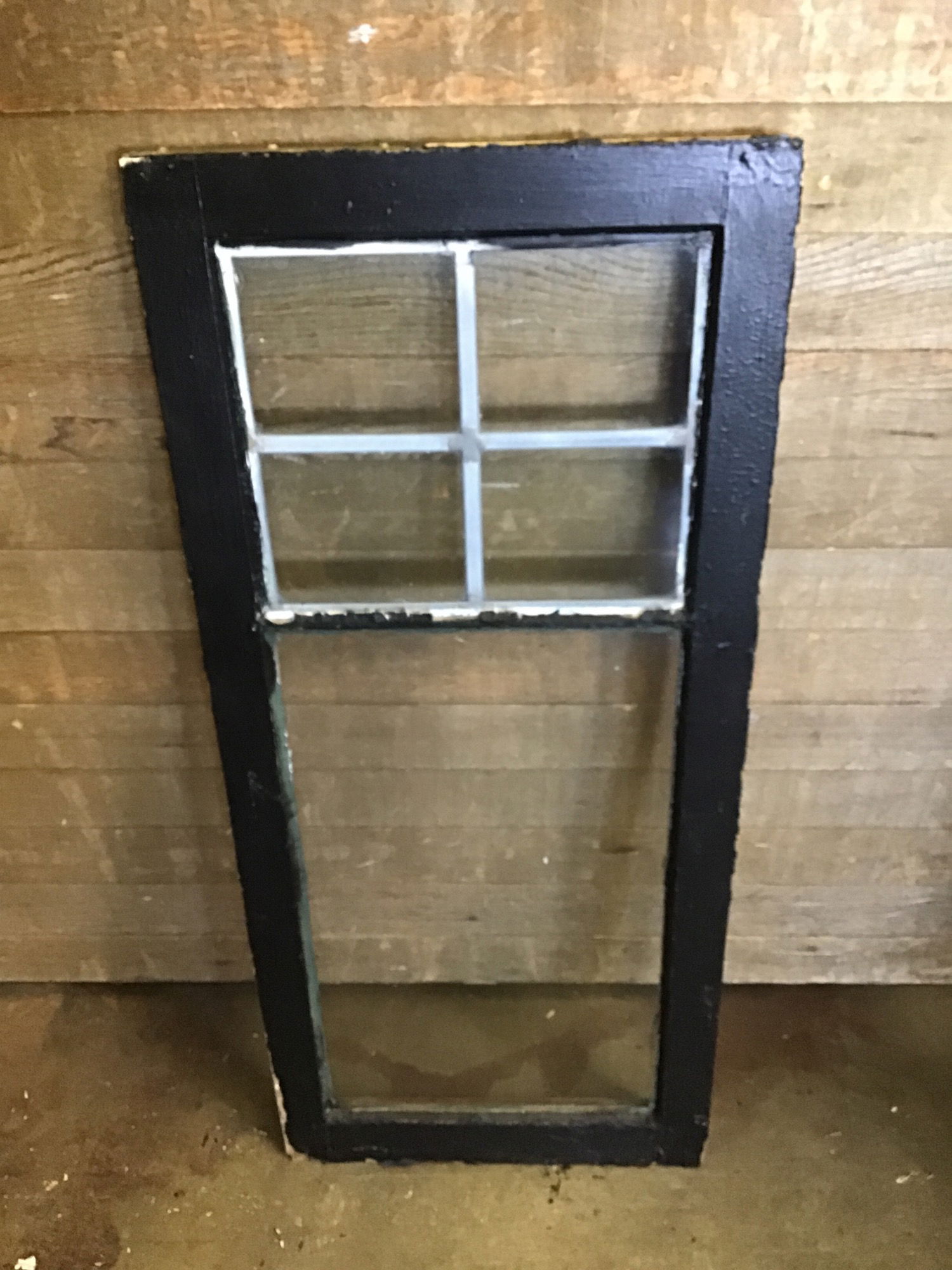 This a nice farmhouse window sash with leaded glass, wooden frame painted black on one side with a beautiful stain on the other side that has an alligatoring finish, with a leaded partition between the true-divided panes and some vintage hardware. Note that this item contains lead. Would be perfect for a cold frame, as porch art, or for a new crafting project!