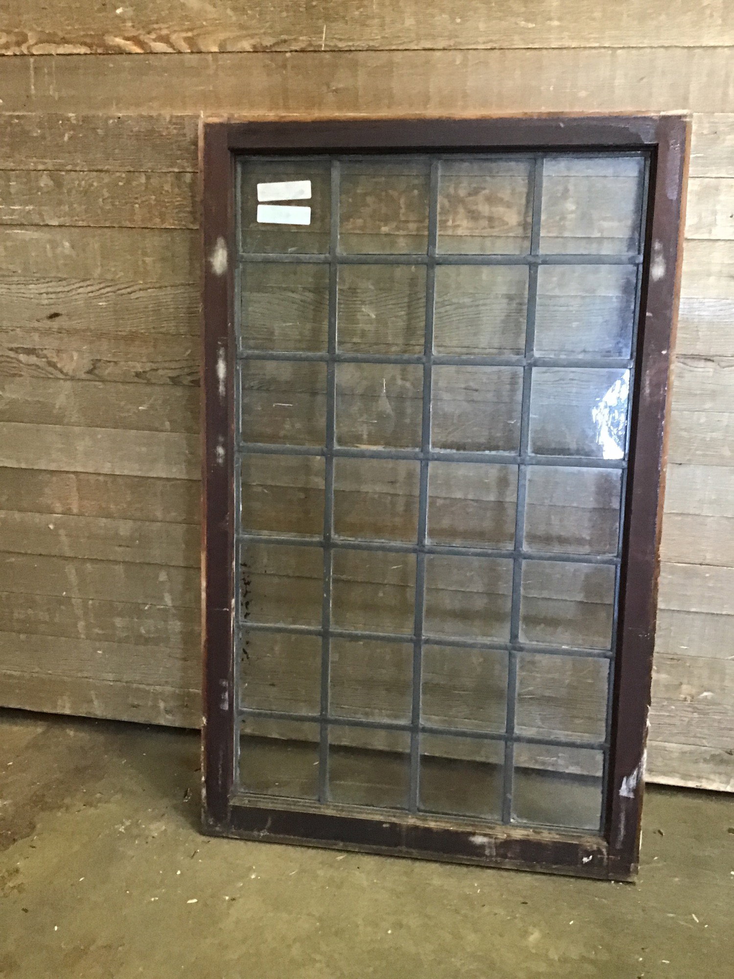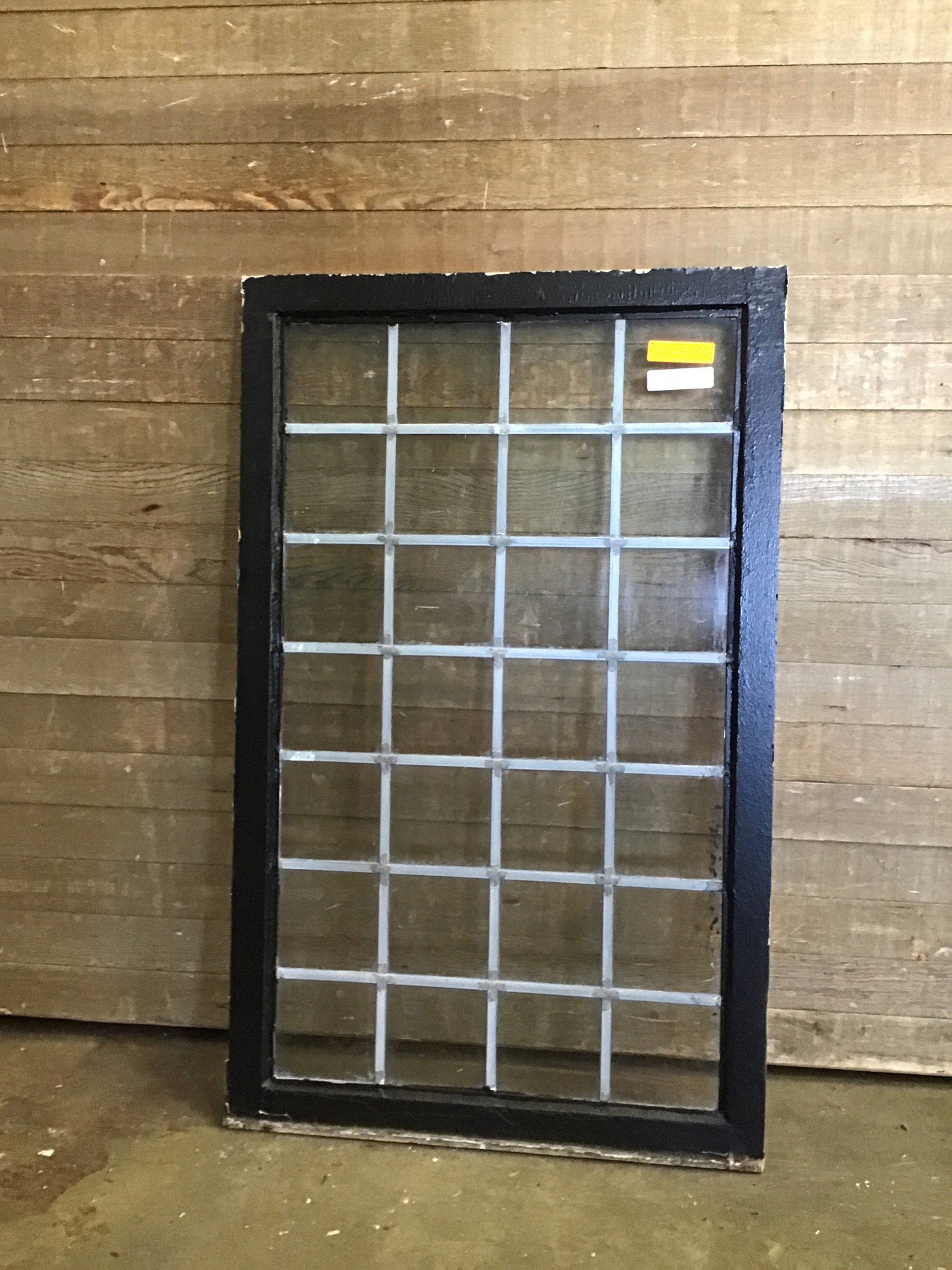 This a gorgeous farmhouse window sash with leaded glass, wooden frame painted black on one side with an alligator stain on the other, with a leaded partition between the 28 true-divided panes and some vintage hardware. One of the 28 panes is damaged slightly with a crack and a hole, price reflects condition. Note that this item contains lead. Would be perfect for a cold frame, as porch art, or for a new crafting project!