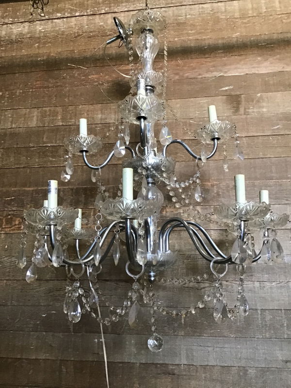Large chandelier with crystals galore and a polished nickel finish frame. Has been rewired and all the crystals are there! We gave it an initial cleaning but it could use another wipe down.