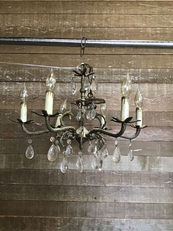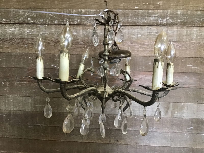 Beautiful 6 arm, Spanish Revival style chandelier. Ornate brass arms with a bouquet of dangly crystals. Wiring looks to have been redone in modern times, but its worth giving it a thorough check before flicking the switch.