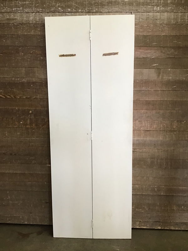 Hollow core bi-fold door in fair, used condition. Has a faux wood grain Oak veneer that has been painted white. Minor cosmetic damage, but overall still functional.