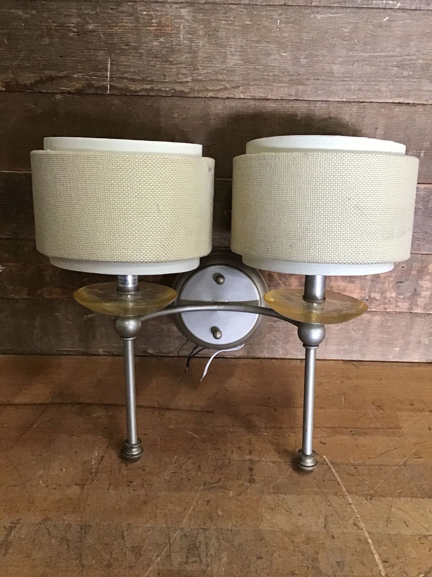 Wall sconce with two bulbs and beige cloth shades. The body is brushed nickle. Wiring looks to be in good condition, though we always recommend a full test prior to installation.