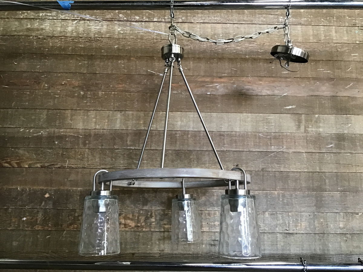 3 light chandelier with faux wood grain wheel and 3 shades lights.