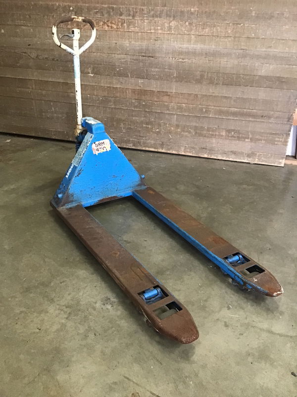Full size pallet jack that has been heavily used but still functions just fine.