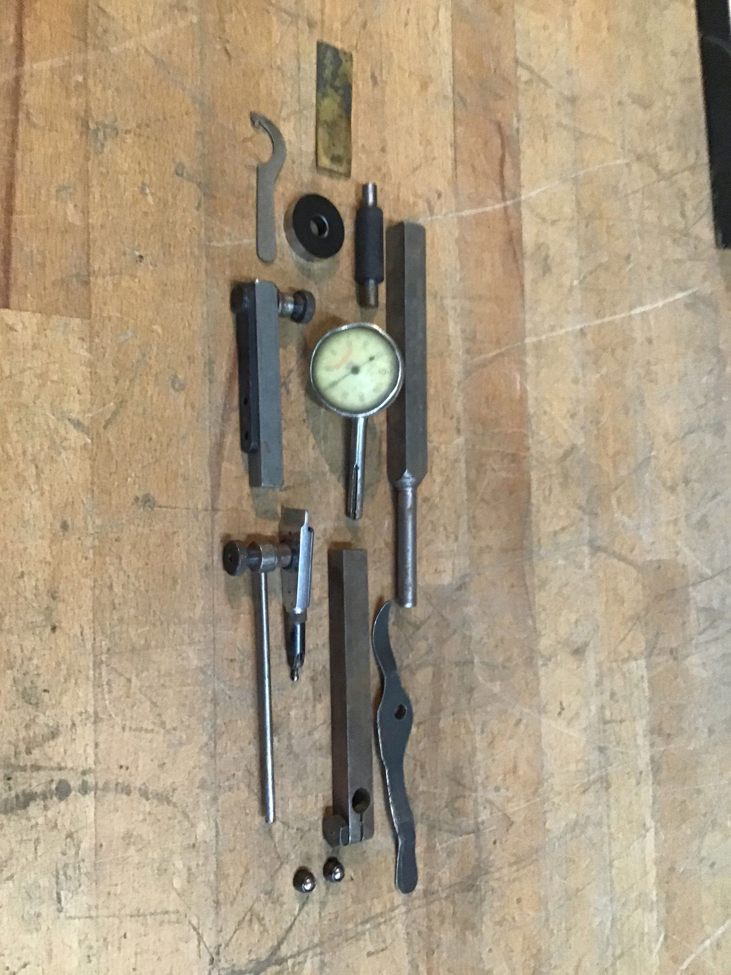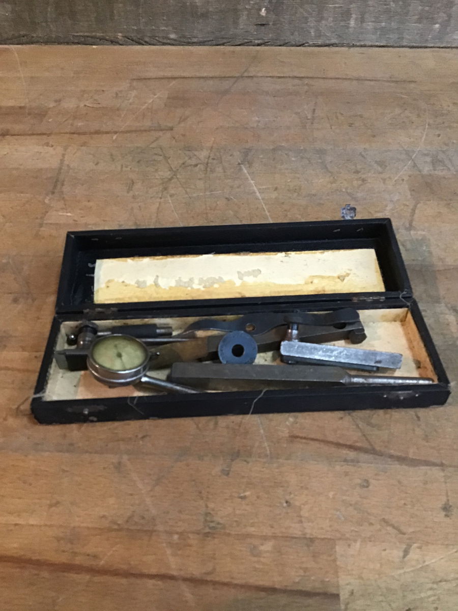 Two types of Starrett runout gauges. The dial gauge is in rough shape, hard to see through the dial cover. The other one is in better shape. Also includes a Starrett 2" measuring standard for a micrometer and some other bits. Comes in a handsome box.