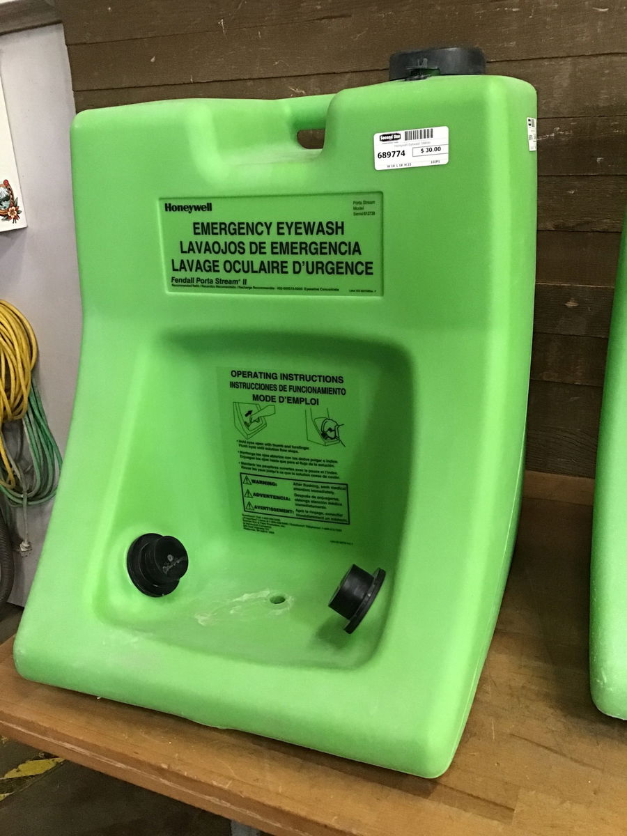 Honeywell Porta Stream II Eyewash Station H-1142 Simply pull handle to activate - Leaves hands free to hold eyes open. Constant 15-minute flow. Economical, 6-month saline life. No plumbing needed. With the solution, these retail for a whopping $460!!!!! Details here