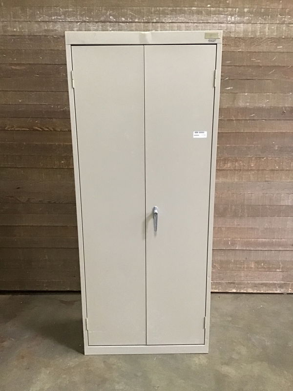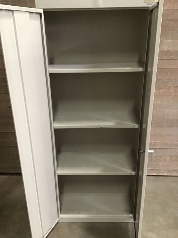 Heavy duty steel shop cabinet with three adjustable shelves. Doesn't come with a key to lock it.