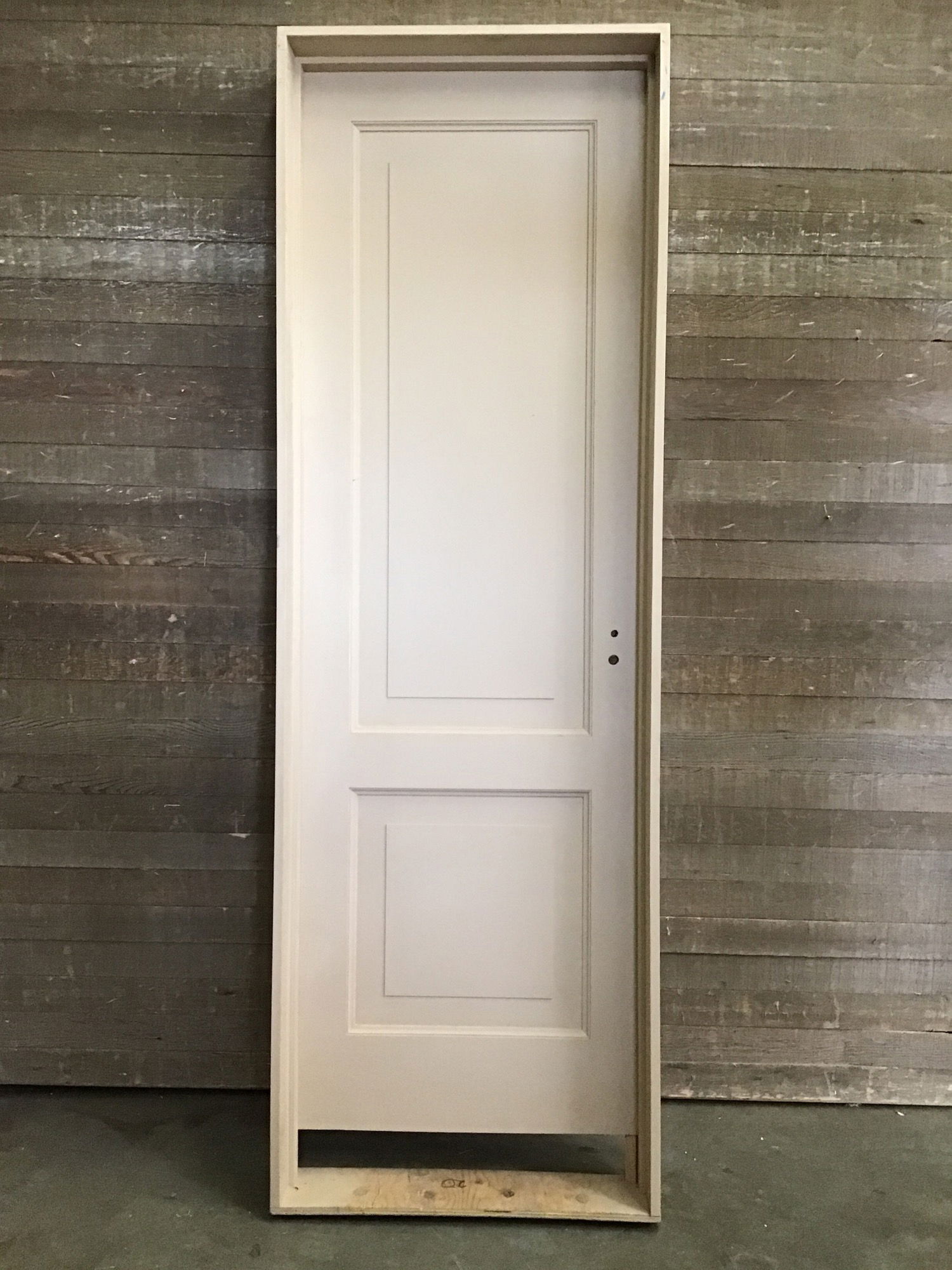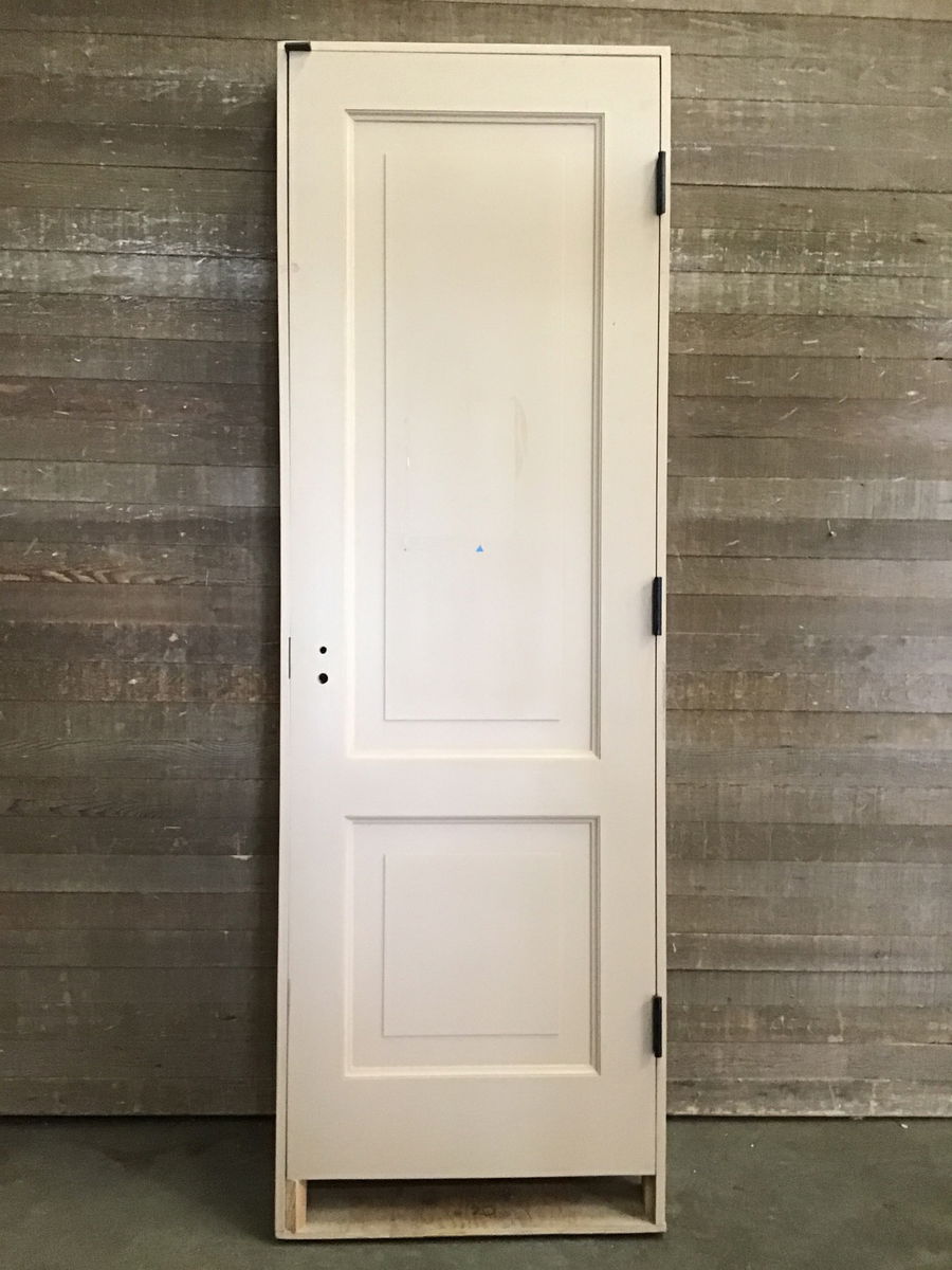 Faux two panel interior solid core door with exterior thickness coming in at 90" tall and 29.625" wide. Painted a peachy beige color on both sides. Prehung in jamb with nice matte black hinges. It's raised from the bottom of the jamb, meaning it was likely intended for a stairwell. Jamb measures 95" in height, but could be cut even if desired. There is also a less common bore hole cut. Price reflects these uncommon traits.