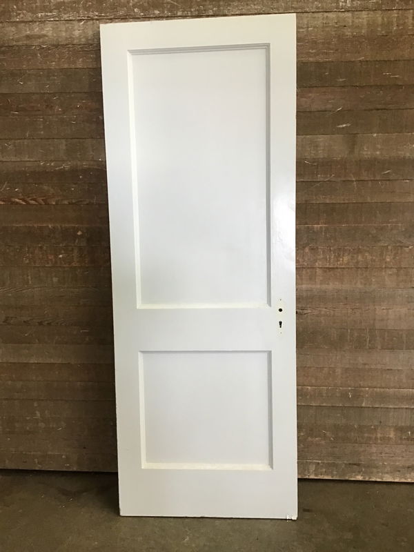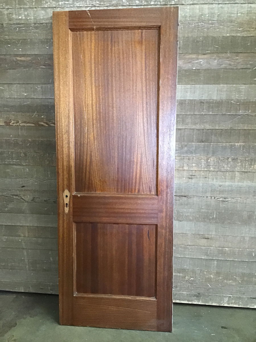Beautiful vintage 30" Mahogany interior door with two recessed panels from a local home built in 1908. This door is exterior thickness, but not recommended for exterior use. Stained on one side and painted white on the other side. The veneer is chipped at a the bottom corners, but should be able to be glued down. Price reflects.