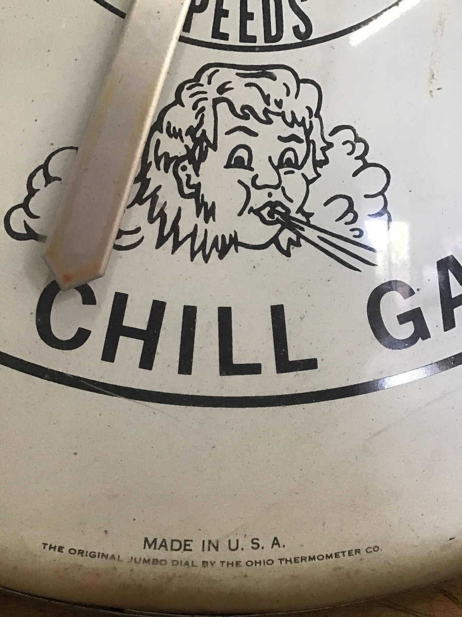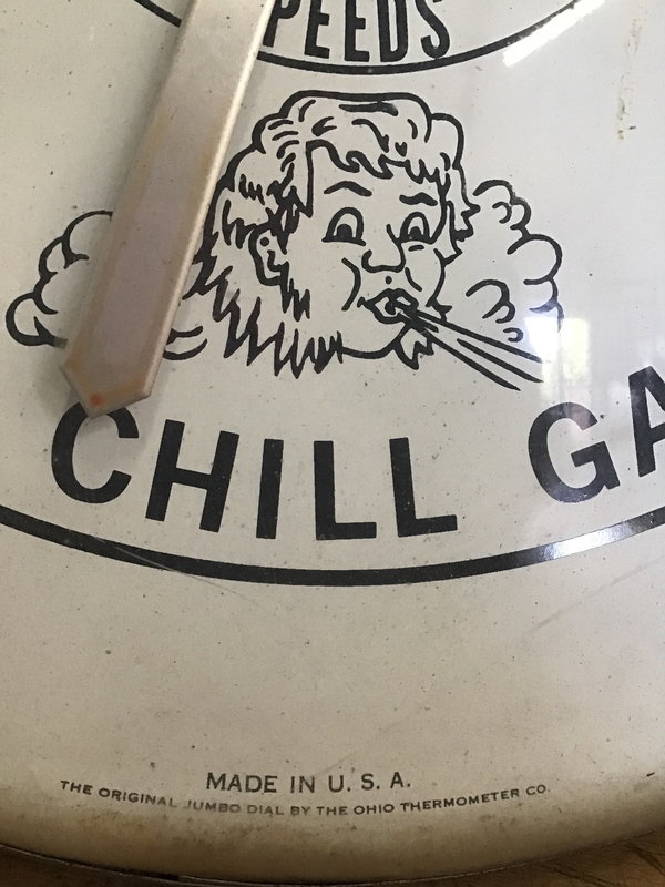 One of the original The Ohio Thermometer Co. Jumbo Dial exterior thermometer. 18" wide and with some dust that should be careful cleaned off of the cover with air and a micro fiber cloth but in otherwise good shape.