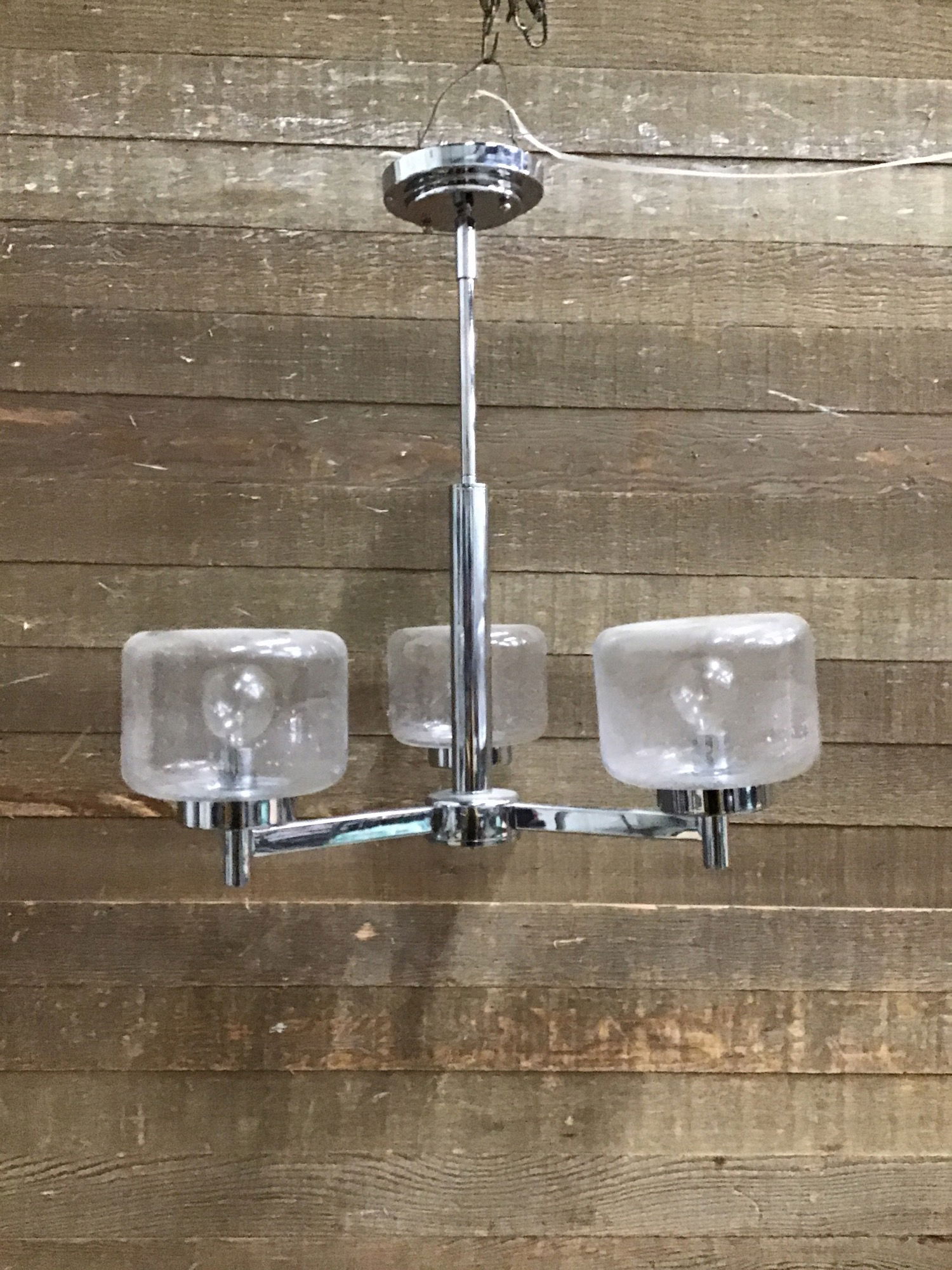 3 light chandelier with a polished nickel finish and seeded glass globular shades.