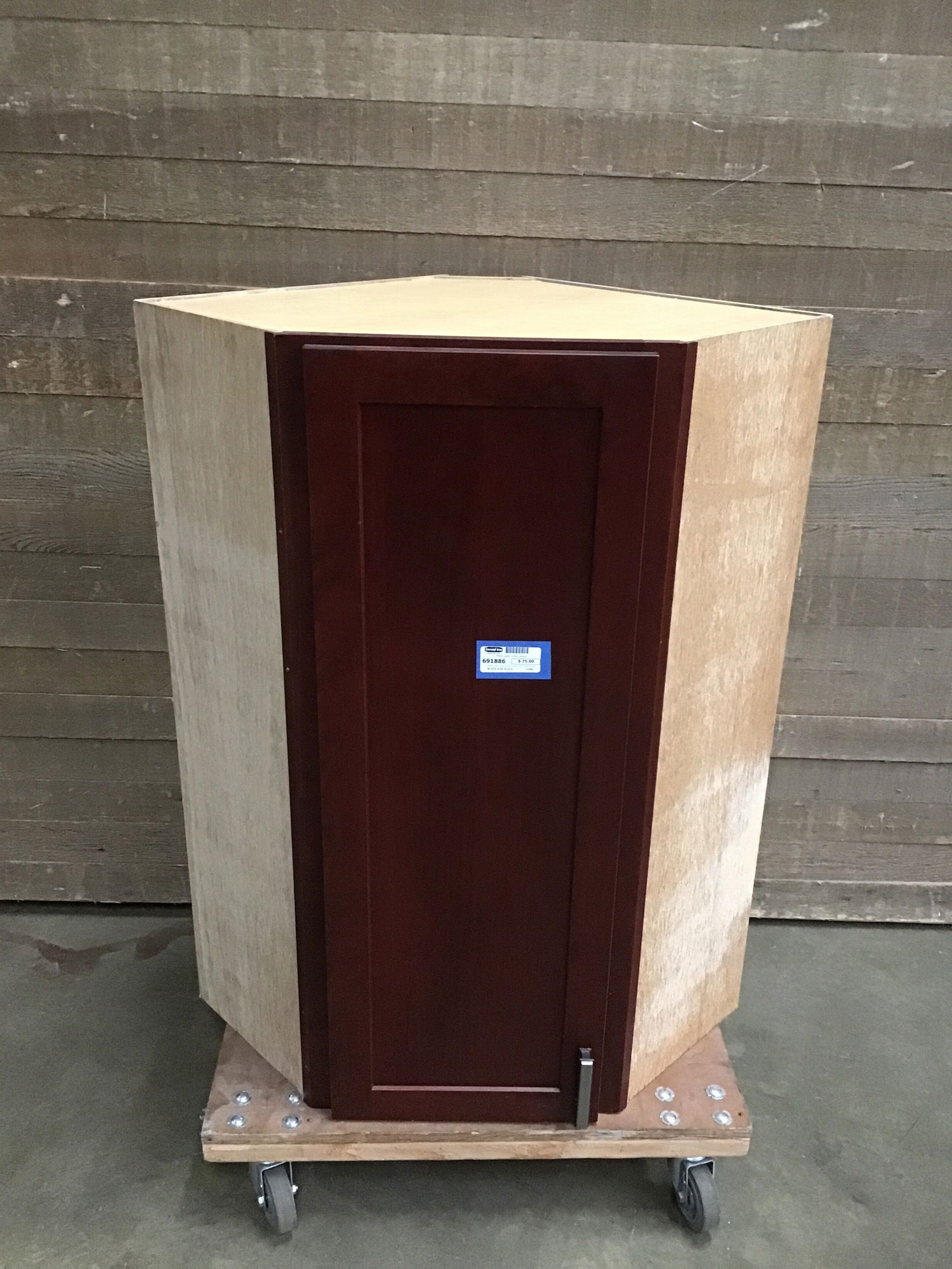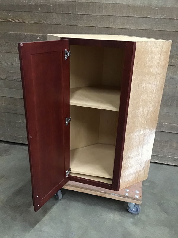 A stately upper corner kitchen cabinet made of plywood with a gorgeous finished maple face with red staining. Originally made by Schrock Cabinets and in a shaker style. Has a nice brushed nickel pull, plenty of storage space with two shelf units.