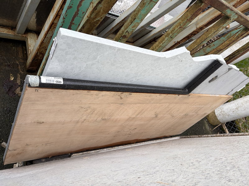 Black granite corner countertop in good, used condition. Has plywood backing and three fully finished edges and three straight cut edges. There is approximately 16 square feet of usable surface area.