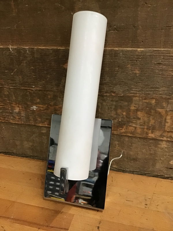 Nice modern style wall sconce with white glass shade and a polished nickel finish. Has some moisture patina coming through the finish.