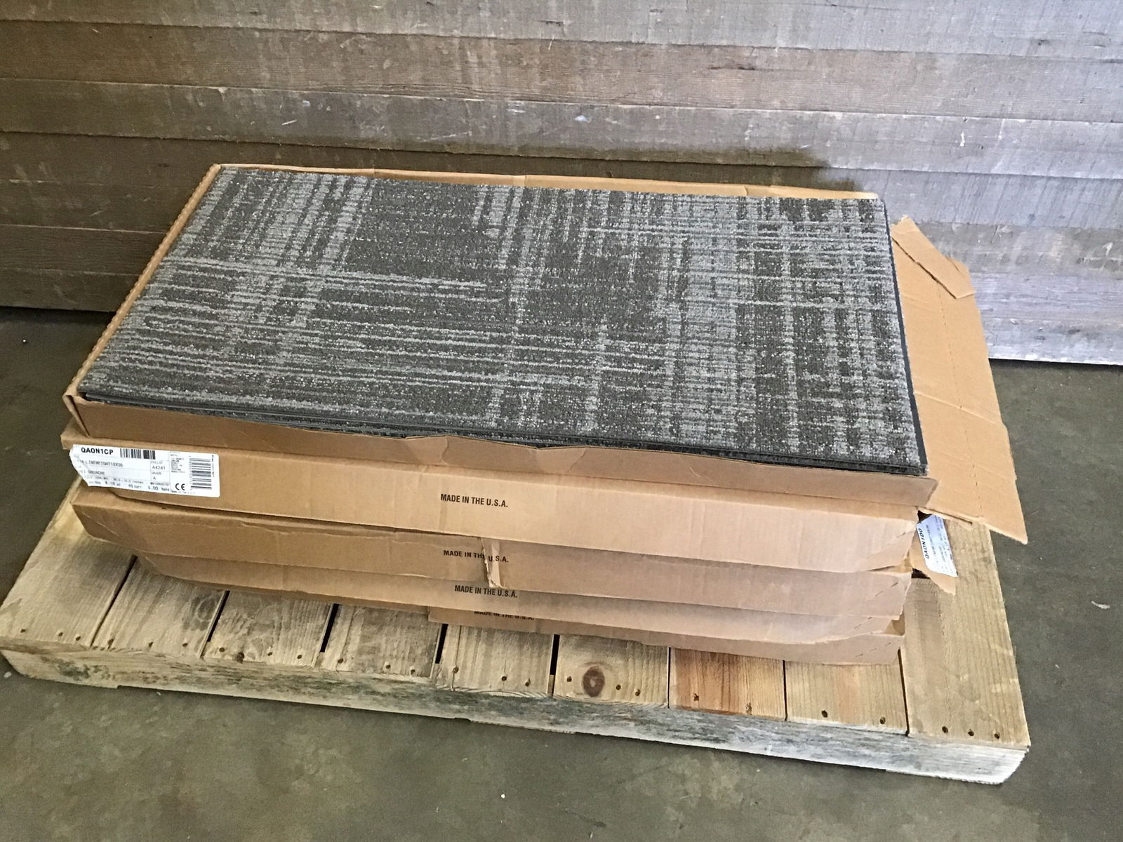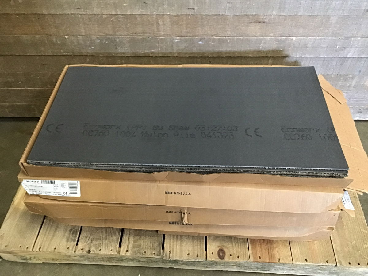 Five new boxes of grey scale carpet tile, color name "Gouache". Four boxes have 10 pieces and one partial box with 9 pieces measuring 18" x 36" for a total of 49 pieces and a total of 220.5 square feet.