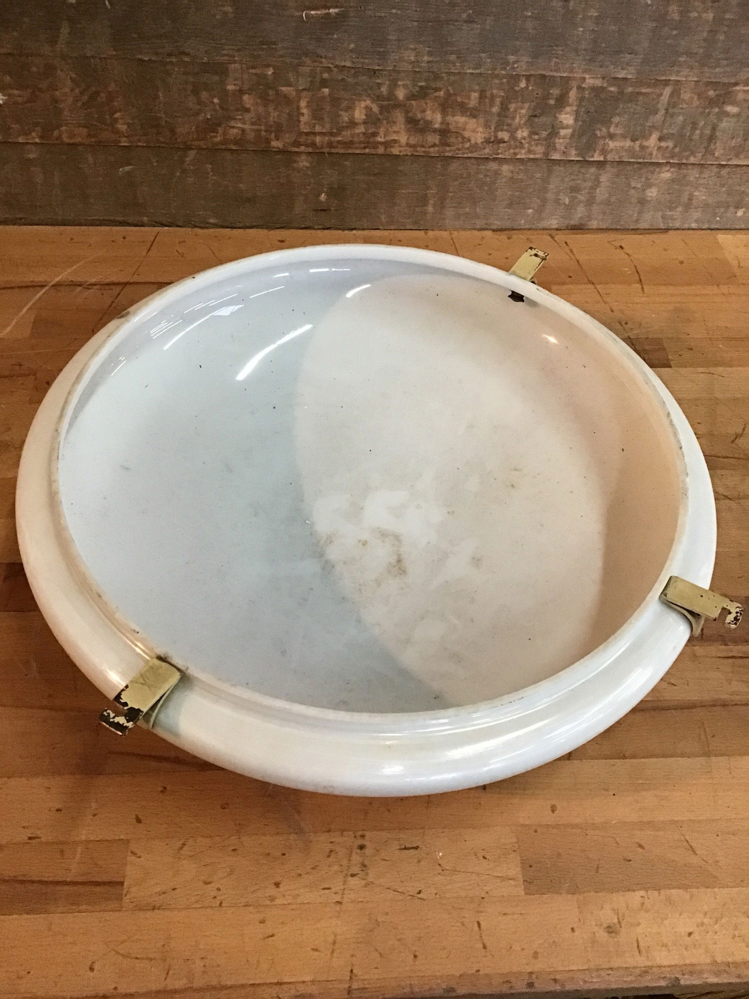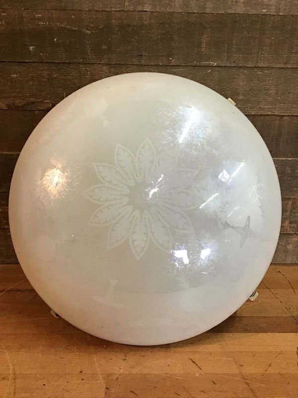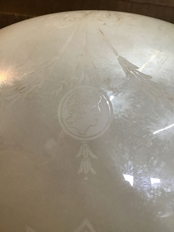 Nice big glass light shade with a white iridescent finish and Greek inspired engravings. Rough opening is 17.25". Great to keep as a light shade, or get creative and use it in an art project!