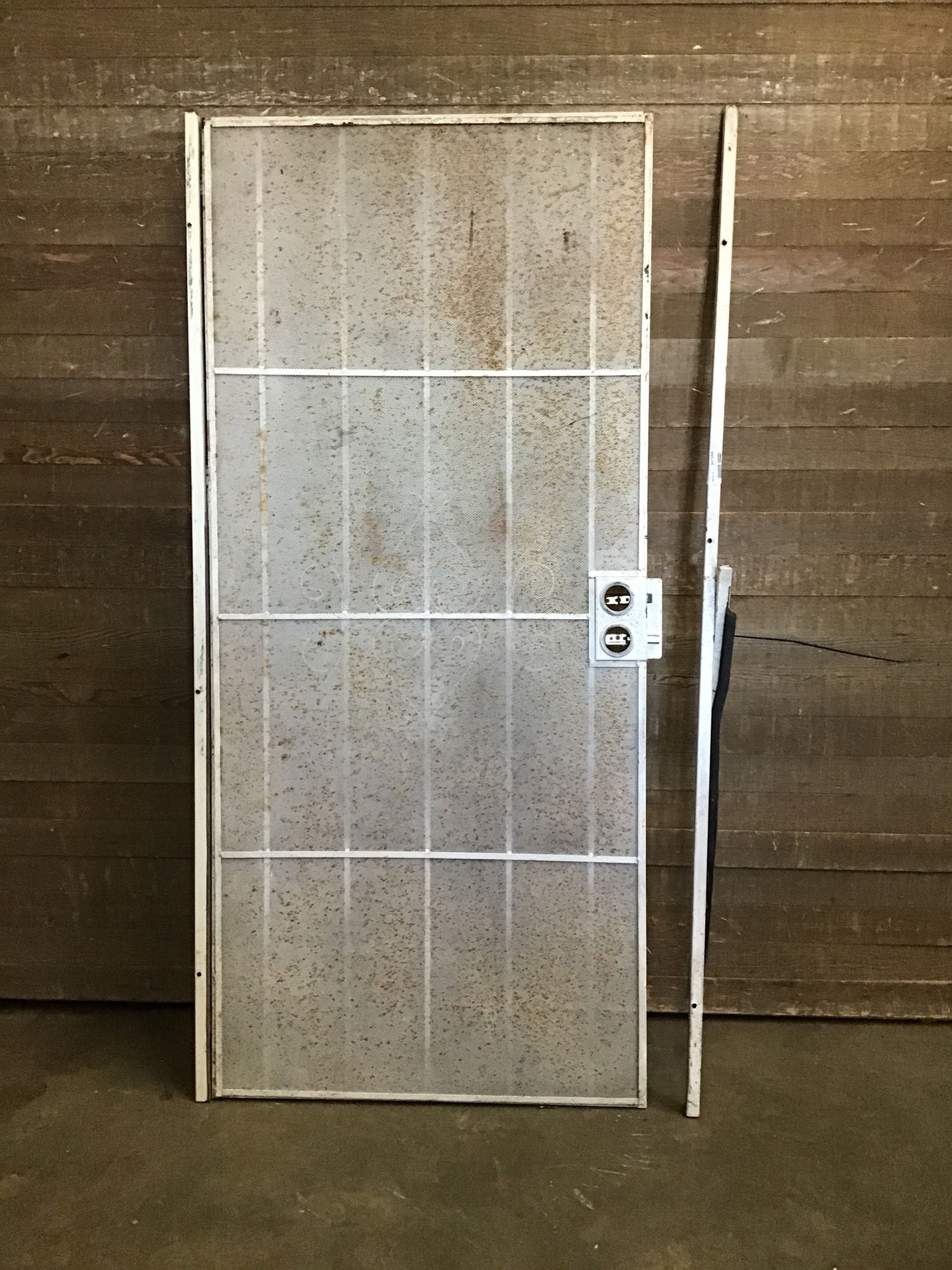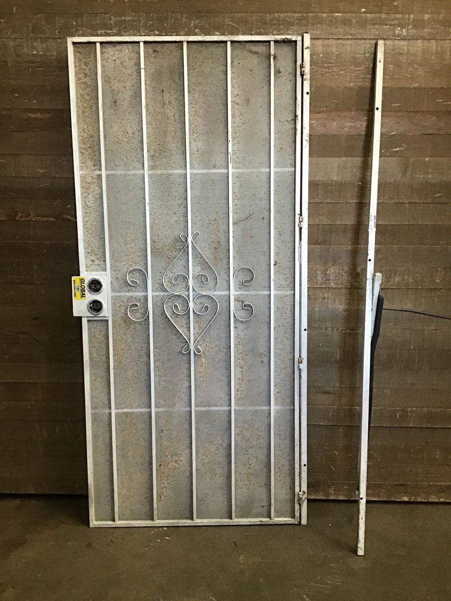 Good used steel security door with stylish steel posts as well as a mesh guard that comes with the parts for the frame (one piece is still on the door and the other two are stored in our parts room). In good shape but has seen some use and has a bit of rust for sure.