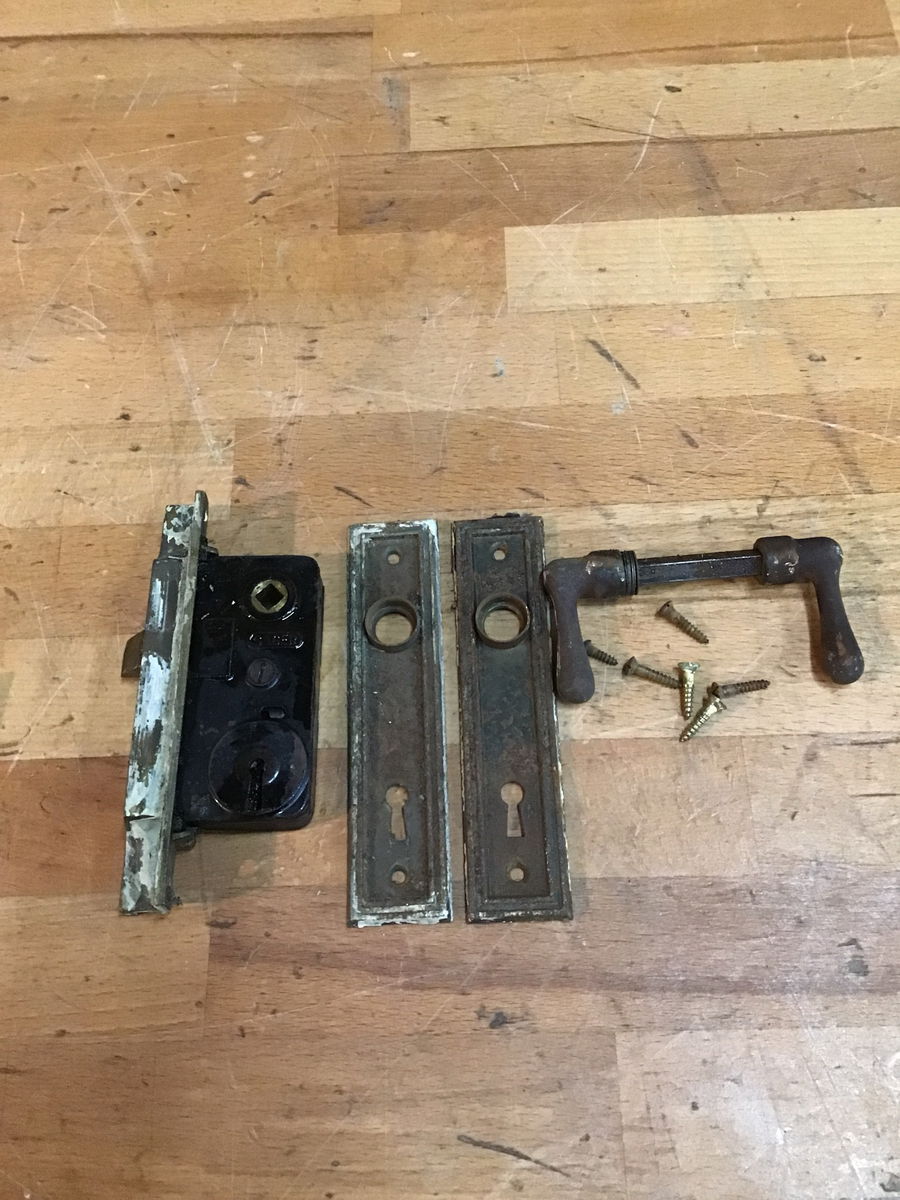 Vintage interior door knobset with door plates and a cute little Sager mortise box!