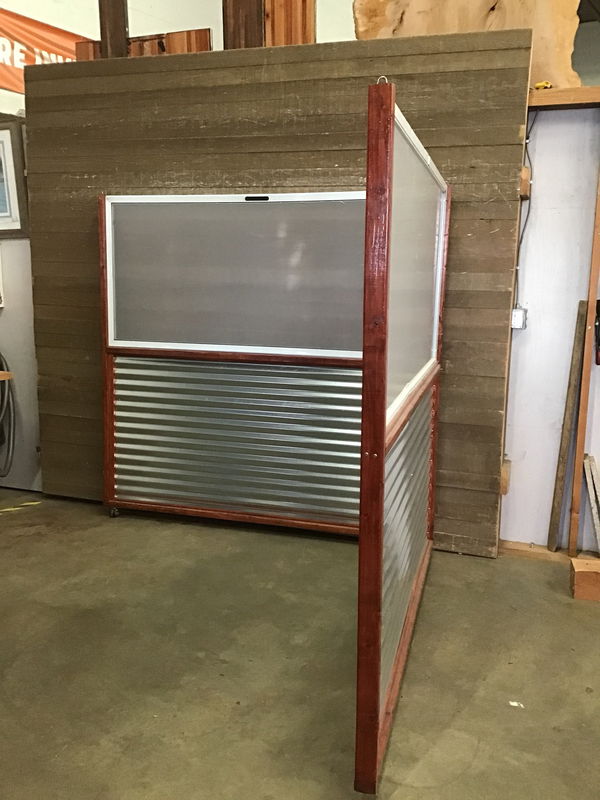 Space separator panel with a corrugated roofing panel on the bottom and an obscured membrane at the top. Could make a great patio, bar or large room separator. Hinged at the ends to fold out.