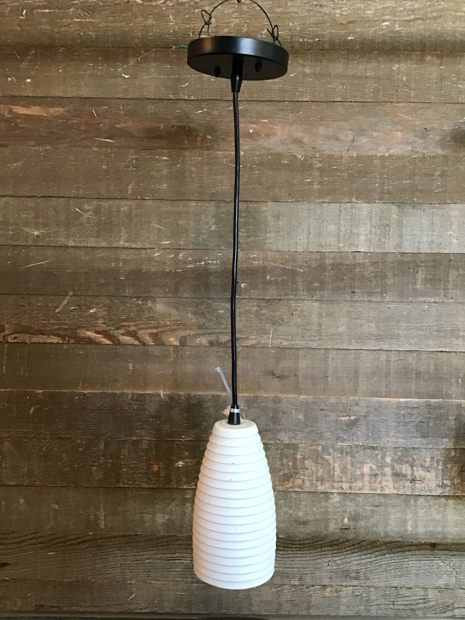 Small 1-light pendant light fixture with white ribbed shade. Wiring is in good condition.