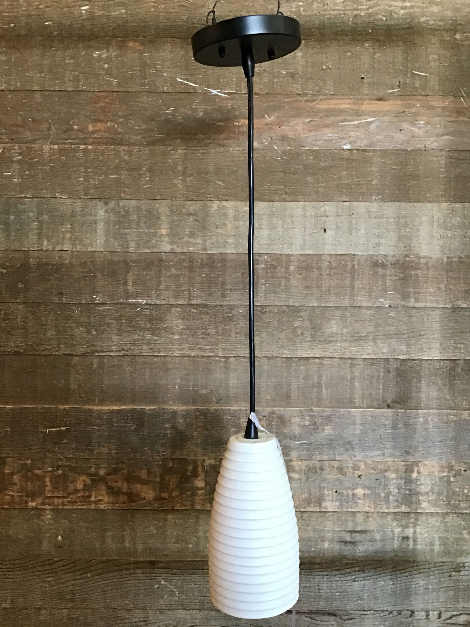 Small 1-light pendant light fixture with white ribbed shade. Wiring is in good condition.