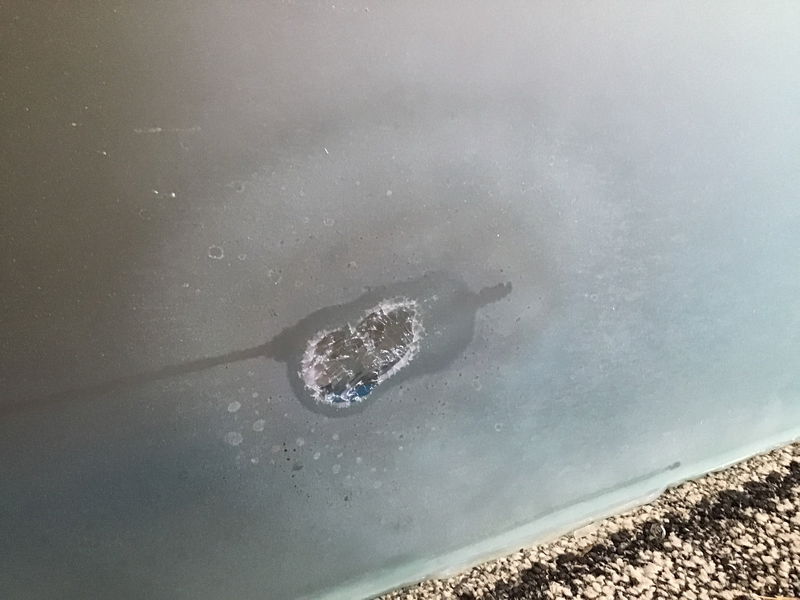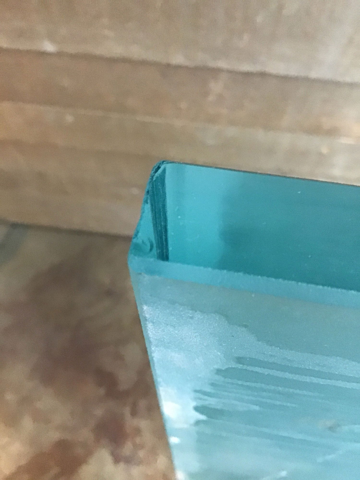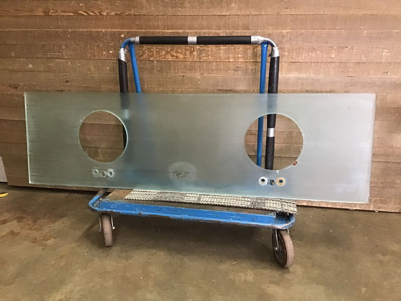 3/4" thick glass double vanity bathroom countertop with two cut outs of 13" for sinks and 4" faucet width. It's a frosted blue tinted color. There are some minor pin chips around the edge, most of which would be covered by caulk once installed. In the center there's some damage where it looks like something was dropped on it. Price reflects damage.