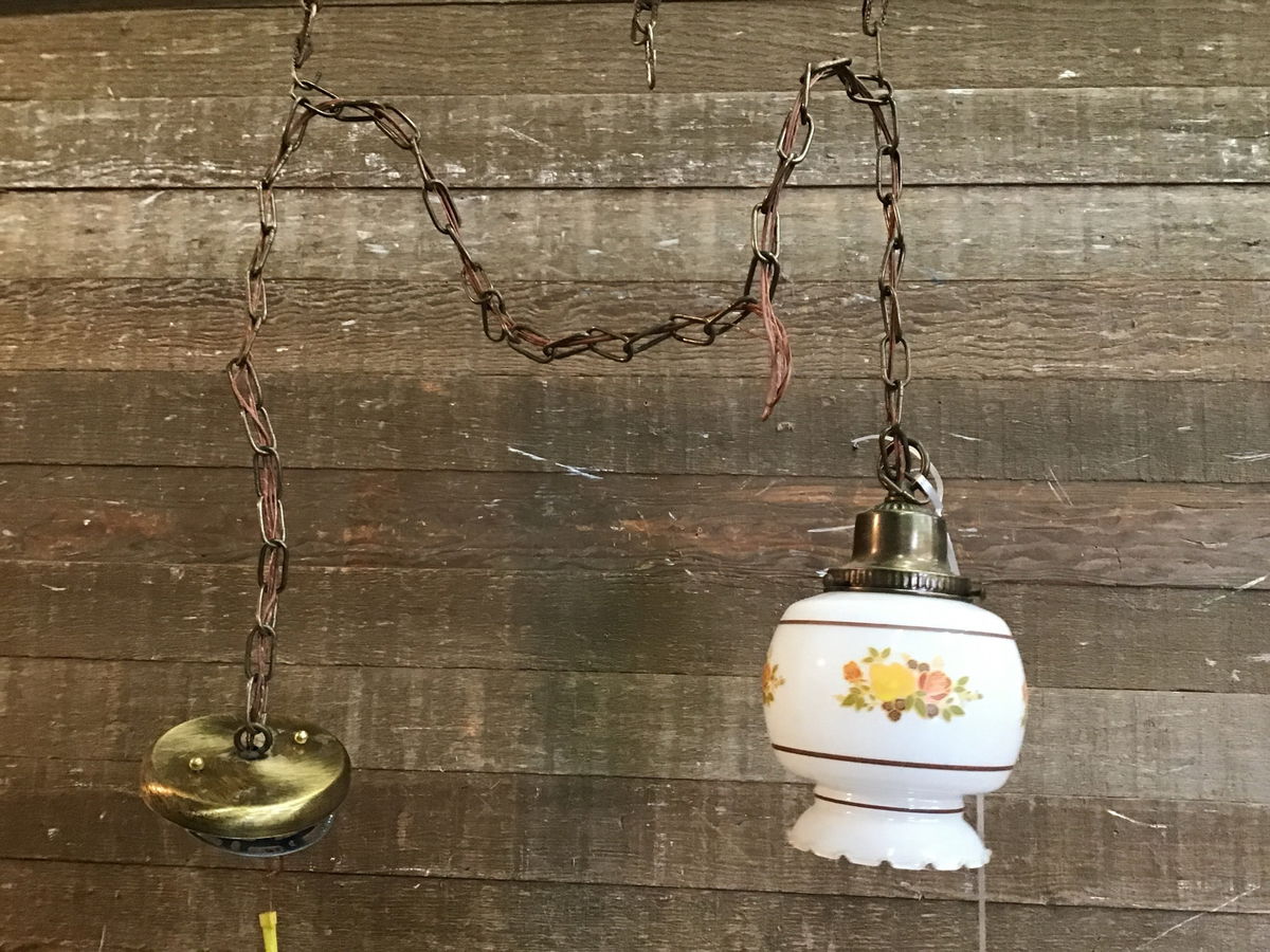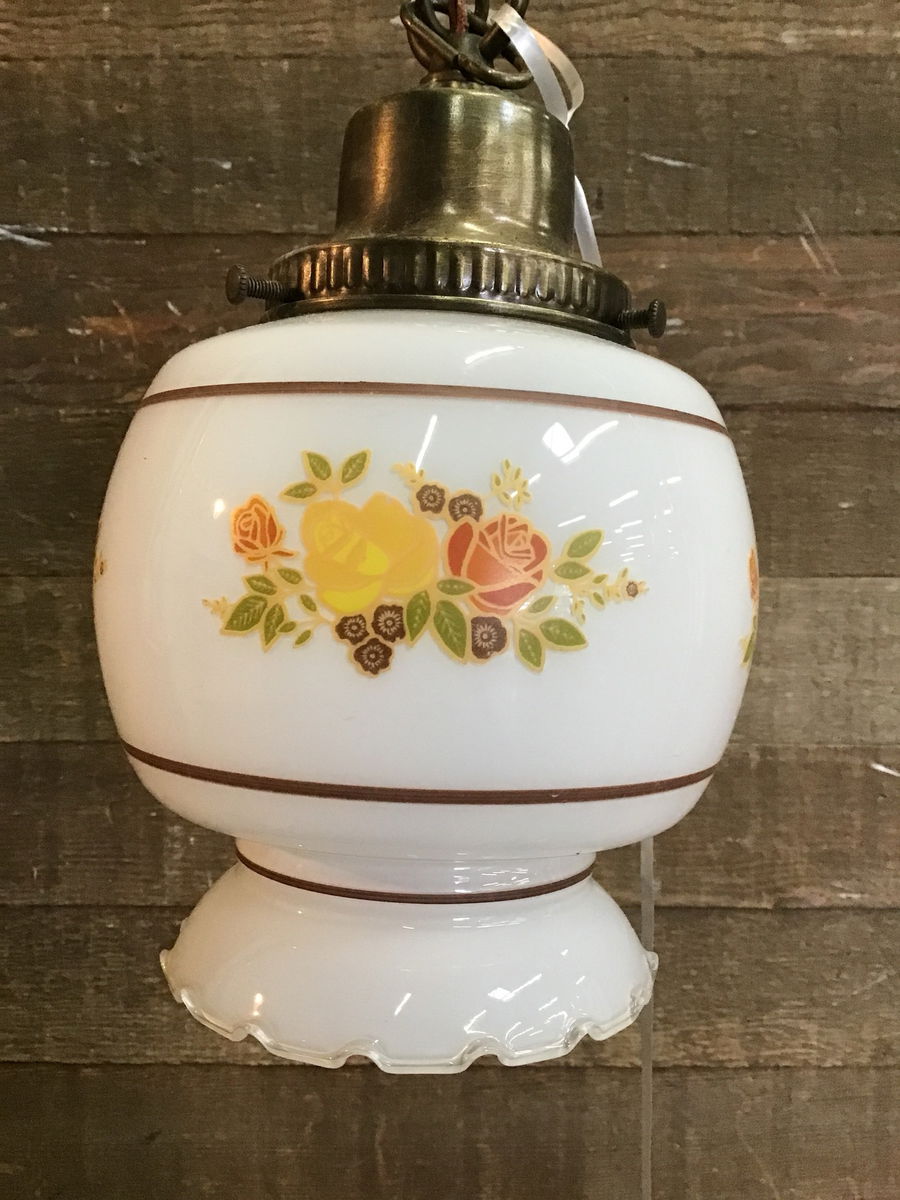 Pretty fun hanging light with a shade straight out of a 70s home catalog. The shades has a scalloped bottom edge and features a brown, green, and orange floral motif. Wiring looks good, though we always recommend a full test prior to installation. Measurement does not include about 3' of chain.