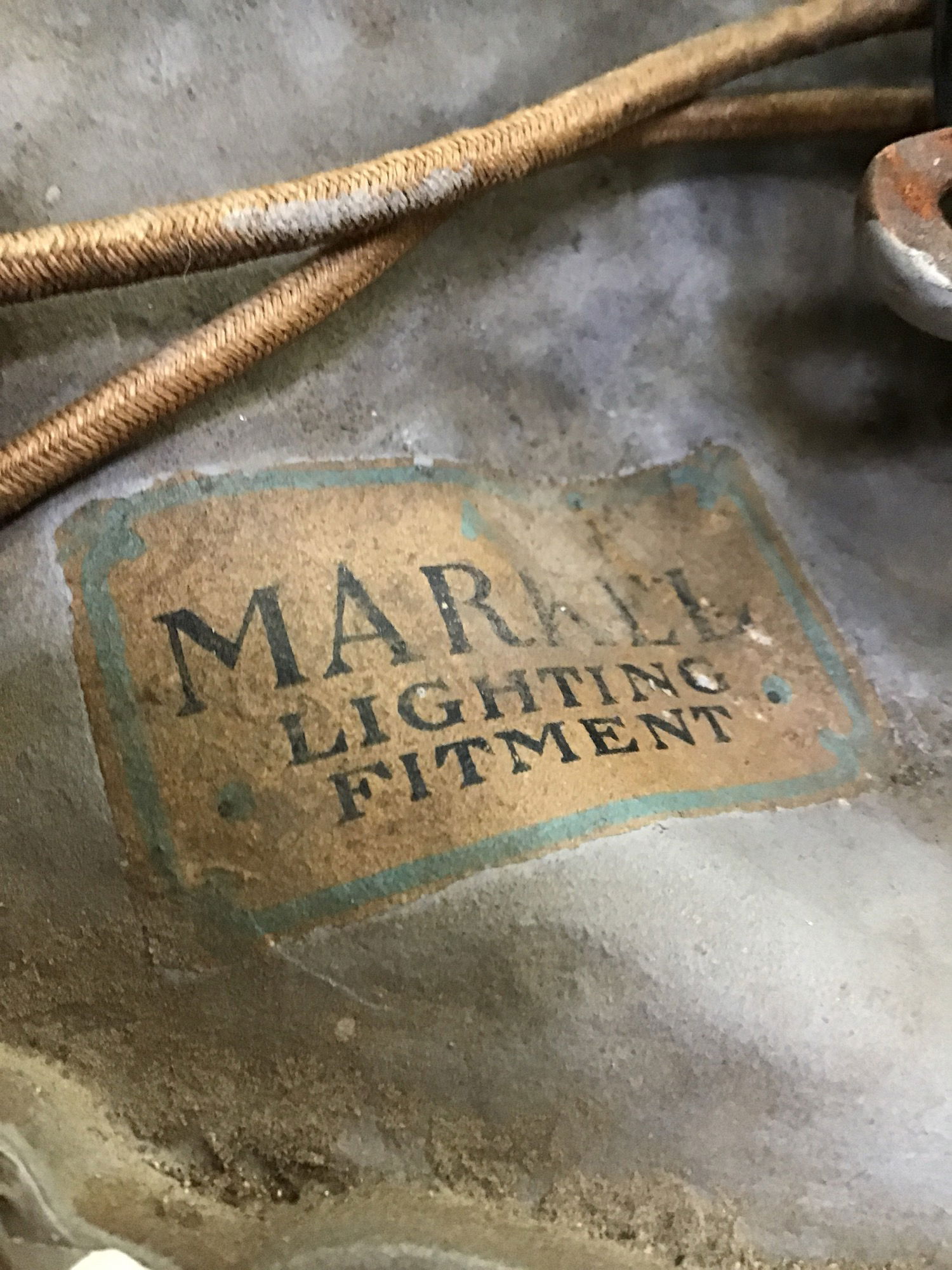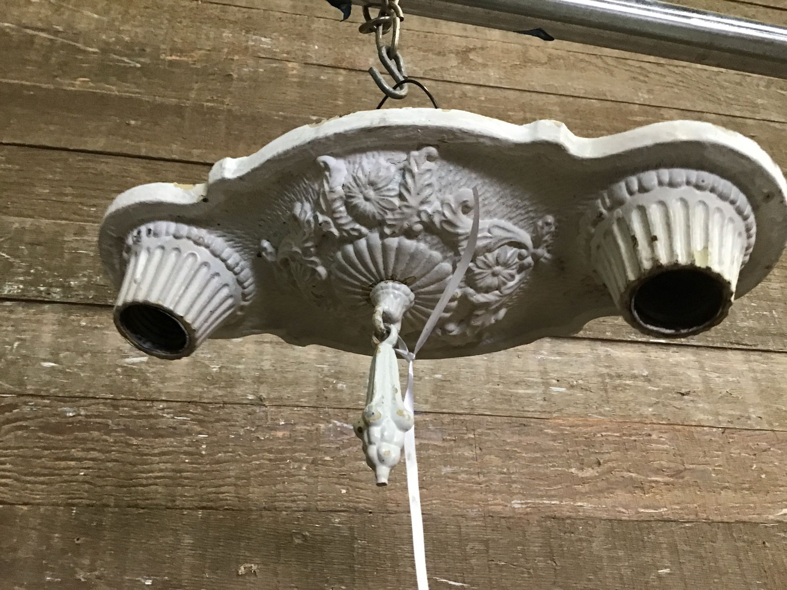 Vintage cast iron, two bulb Markel ceiling light. Has been painted white over the original paint job. Wiring looks original but in good condition, though we always recommend a full test prior to installation. Would look great with some decorative Edison style bulbs.