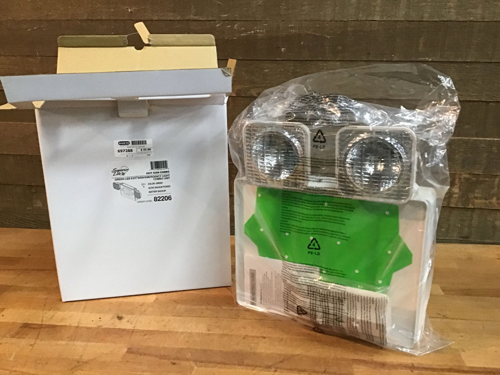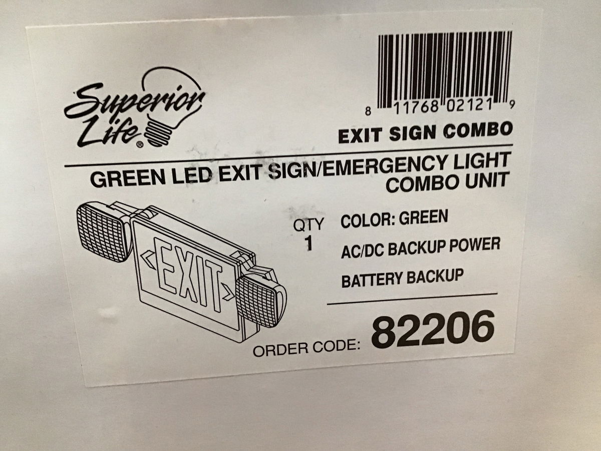 Superior Life emergency light and sign Model #82206, with green LED letters and battery backup. Retails new for $107.
