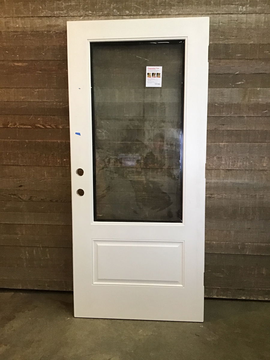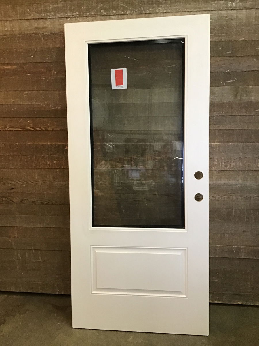 New, never installed, 36" ThermaTru fiberglass clad exterior door with a half lite (that's more like 3/4 lite) and one raised panel under the lite. Glass is tempered and thermopane. Left hand swing hinge cuts and knob and deadbolt bore holes. Primed and ready to be painted the color of your choice. There may be some minor cosmetic damage.