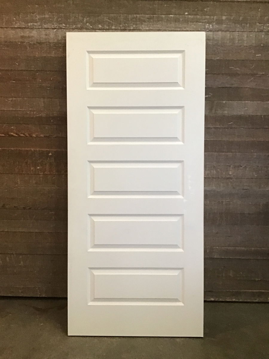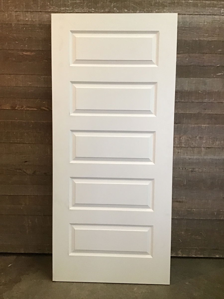 New, never installed 36" interior door with five raised panels. This door is an interior door with exterior thickness of 1.75". This door has a primed masonite veneer that is ready to paint the color of your choice. No hinge cuts or bore holes. Great door for garage to house. There is one small raised spot that got wet, price reflects.