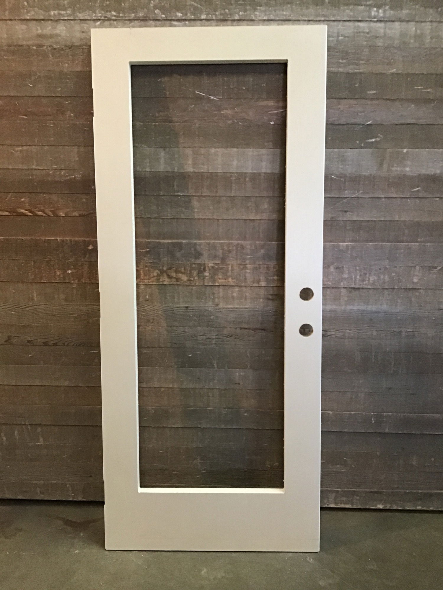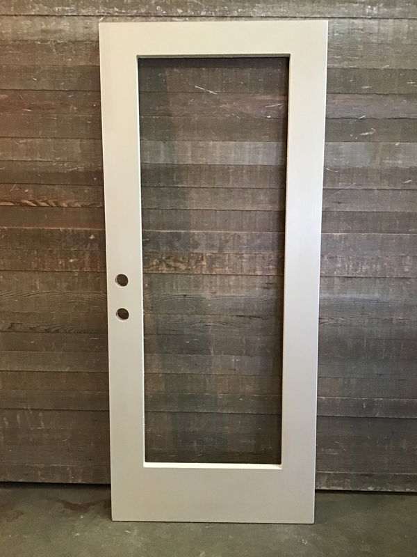 New, never installed, 34" fiberglass French door without glass insert. Fiberglass is primed and has a faux wood grain. Right hand hinge cuts and knob and dead bolt bore holes. Great deal on an ext. door, just add your own glass.